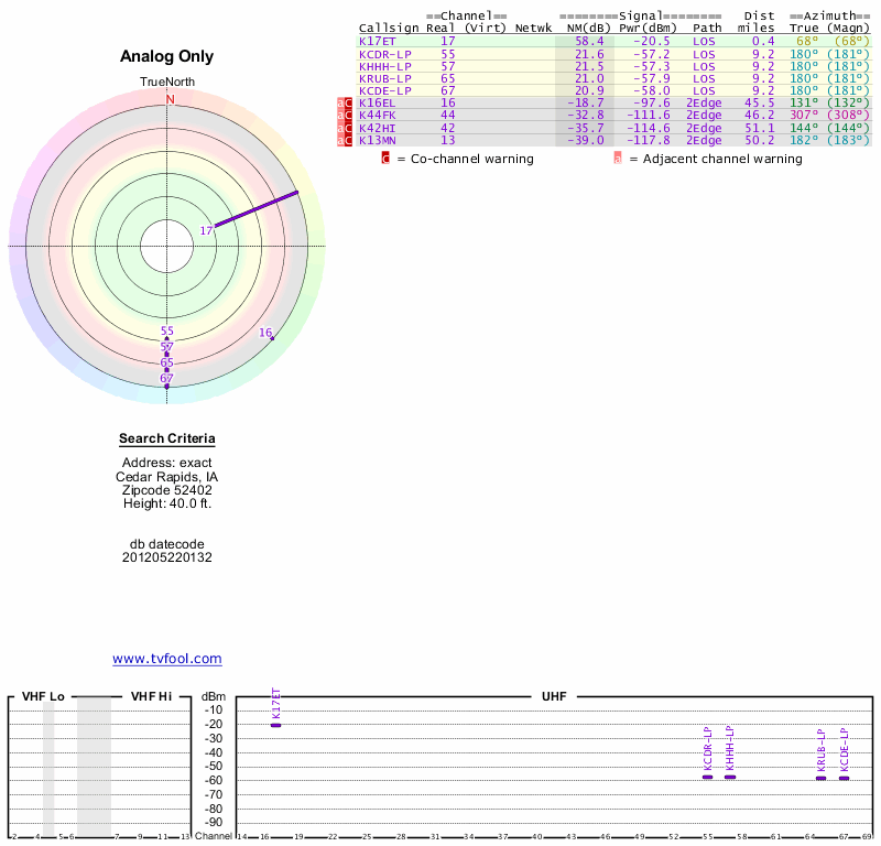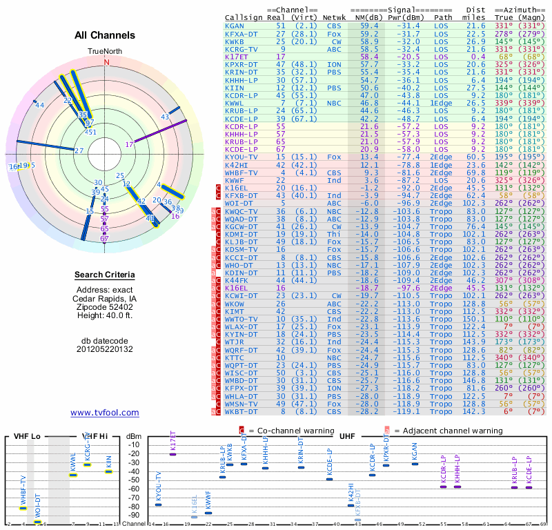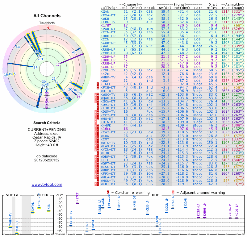 Here are the results for your location. The transmitter database was last updated on June 7, 2013. For more information about these plots and how to interpret them, please check out the Signal Analysis FAQ.