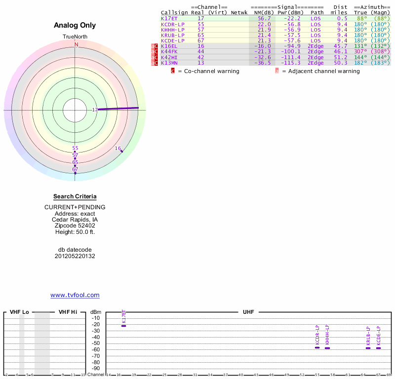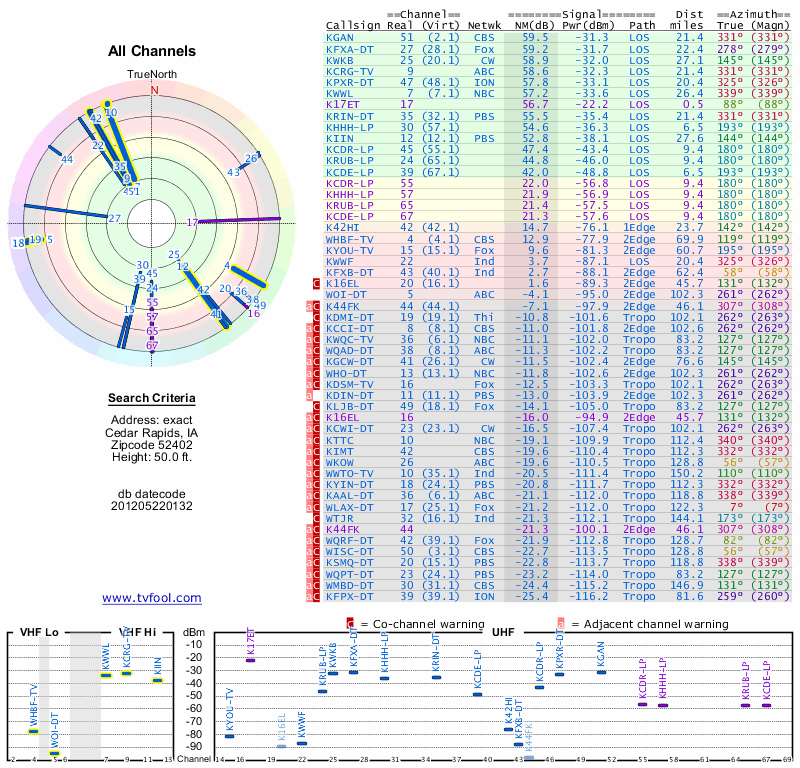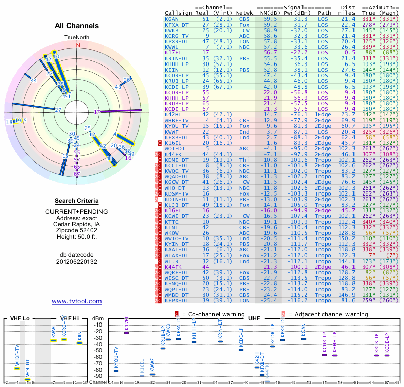 Here are the results for your location. The transmitter database was last updated on June 7, 2013. For more information about these plots and how to interpret them, please check out the Signal Analysis FAQ.