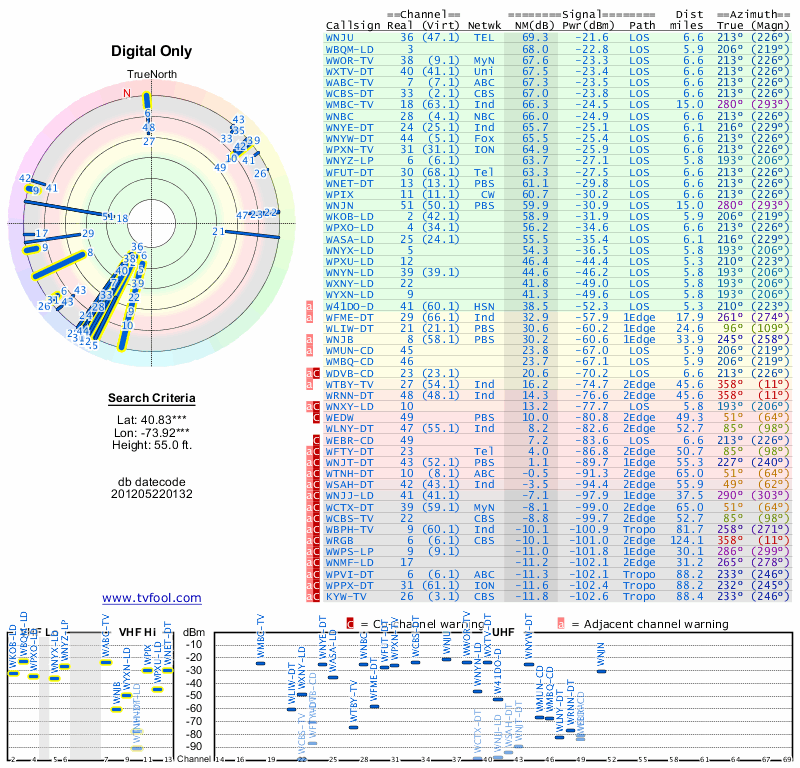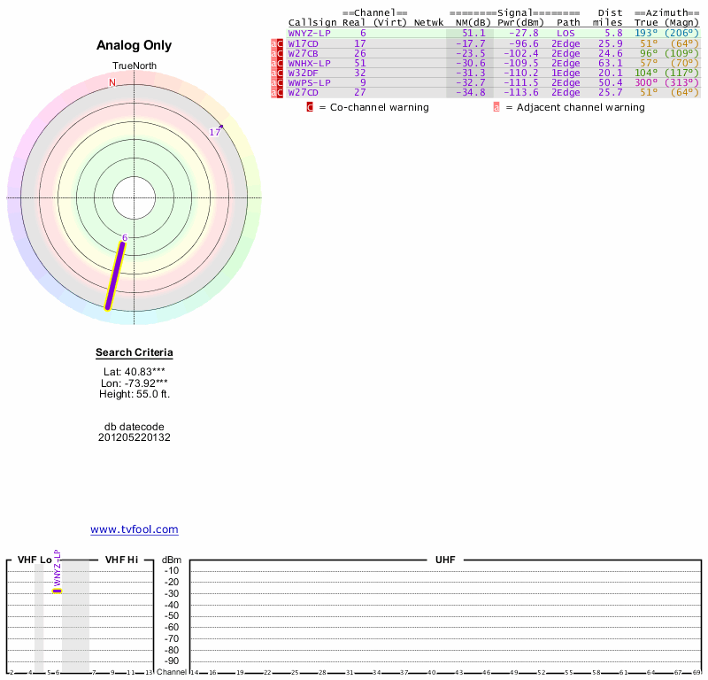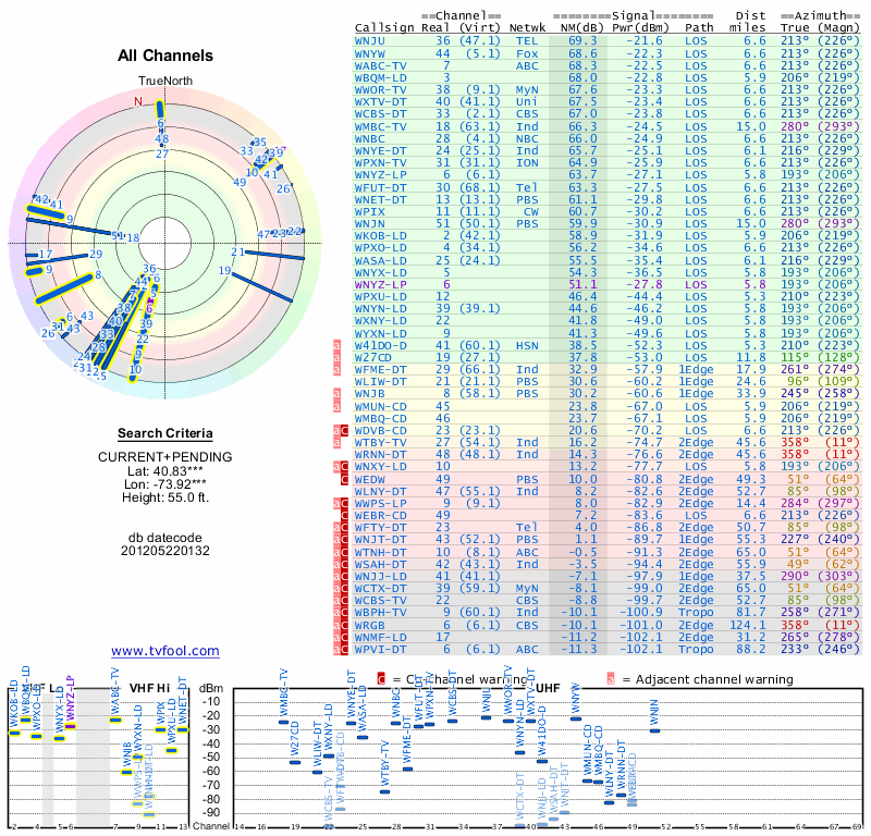 Here are the results for your location. The transmitter database was last updated on June 7, 2013. For more information about these plots and how to interpret them, please check out the Signal Analysis FAQ.