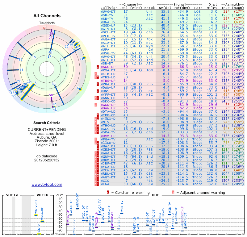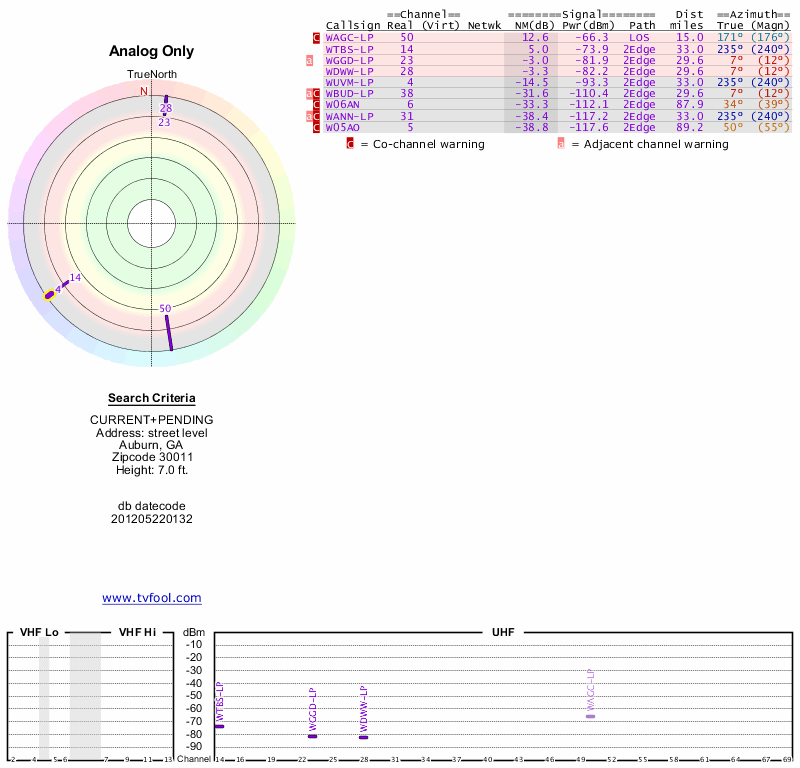 Here are the results for your location. The transmitter database was last updated on June 7, 2013. For more information about these plots and how to interpret them, please check out the Signal Analysis FAQ.
