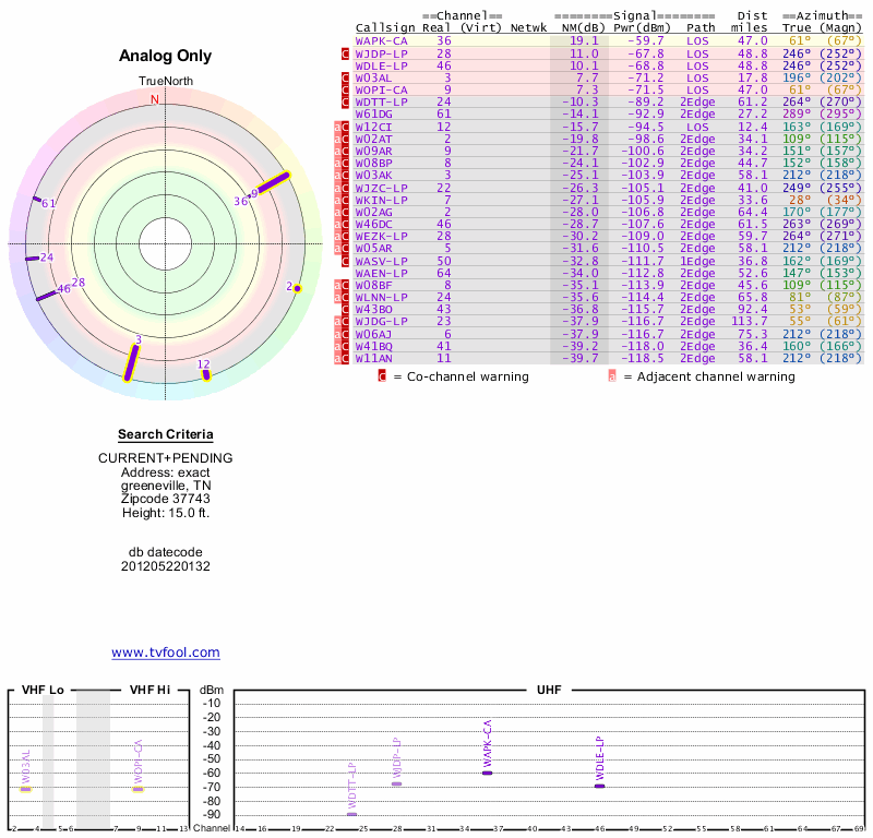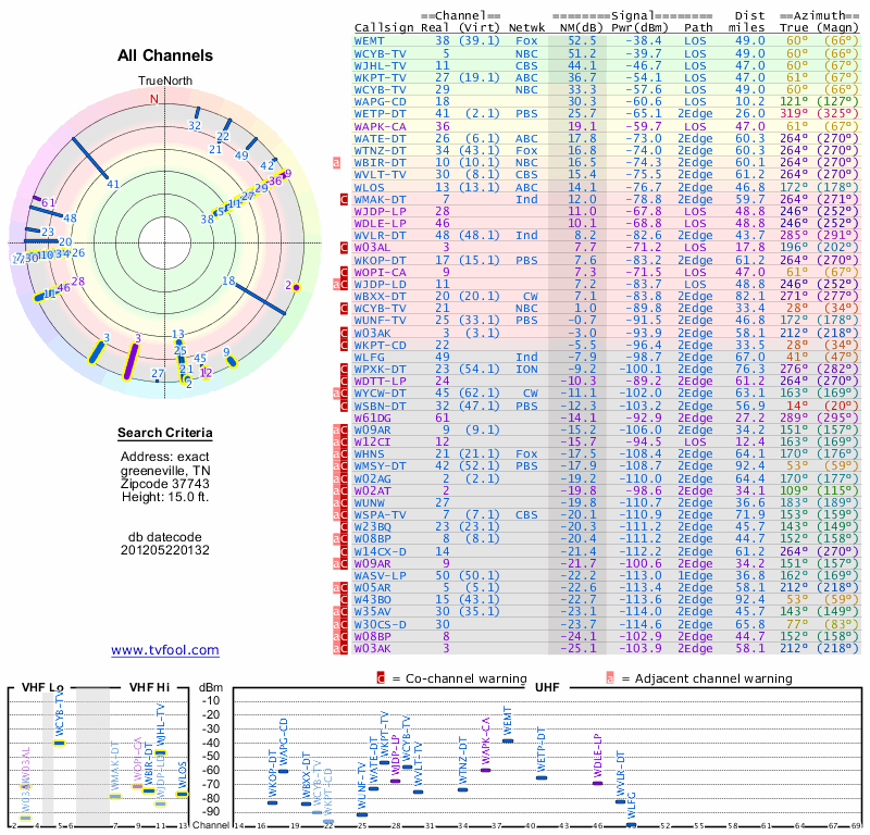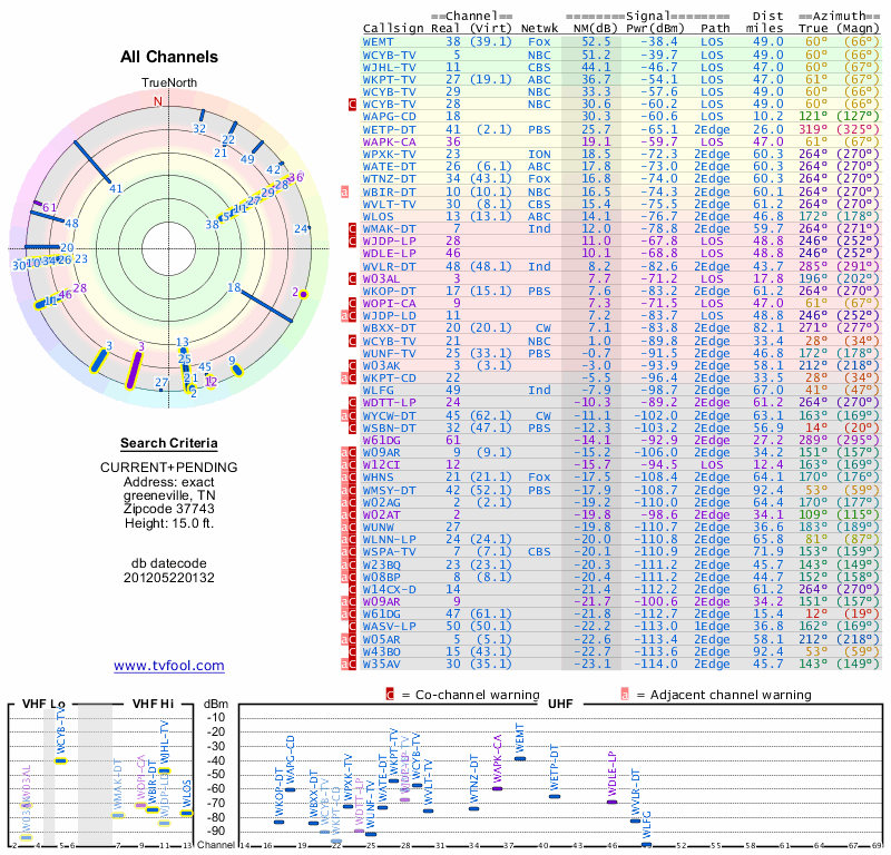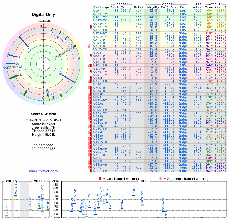 Here are the results for your location. The transmitter database was last updated on June 7, 2013. For more information about these plots and how to interpret them, please check out the Signal Analysis FAQ.