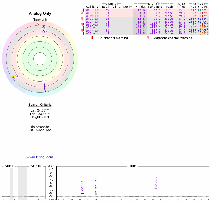 Here are the results for your location. The transmitter database was last updated on June 7, 2013. For more information about these plots and how to interpret them, please check out the Signal Analysis FAQ.