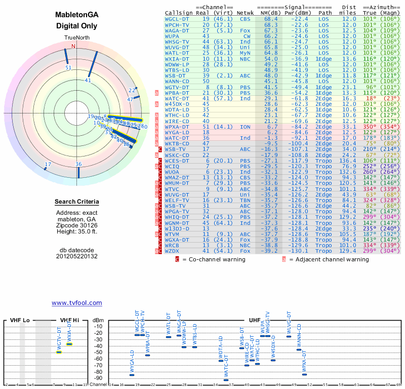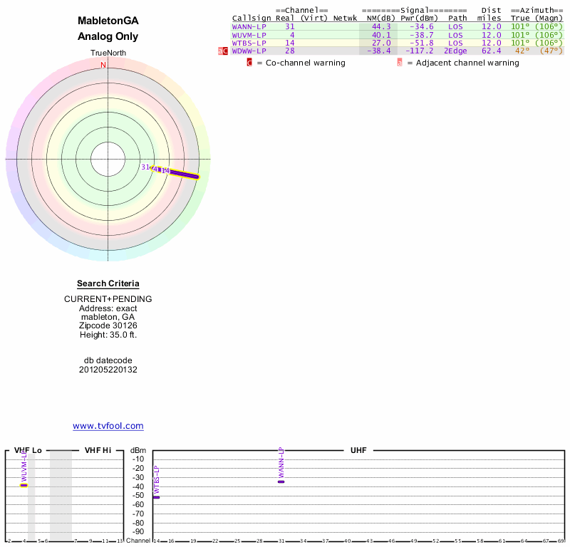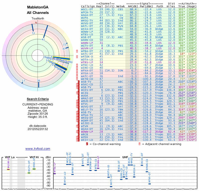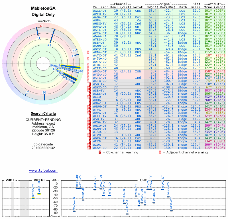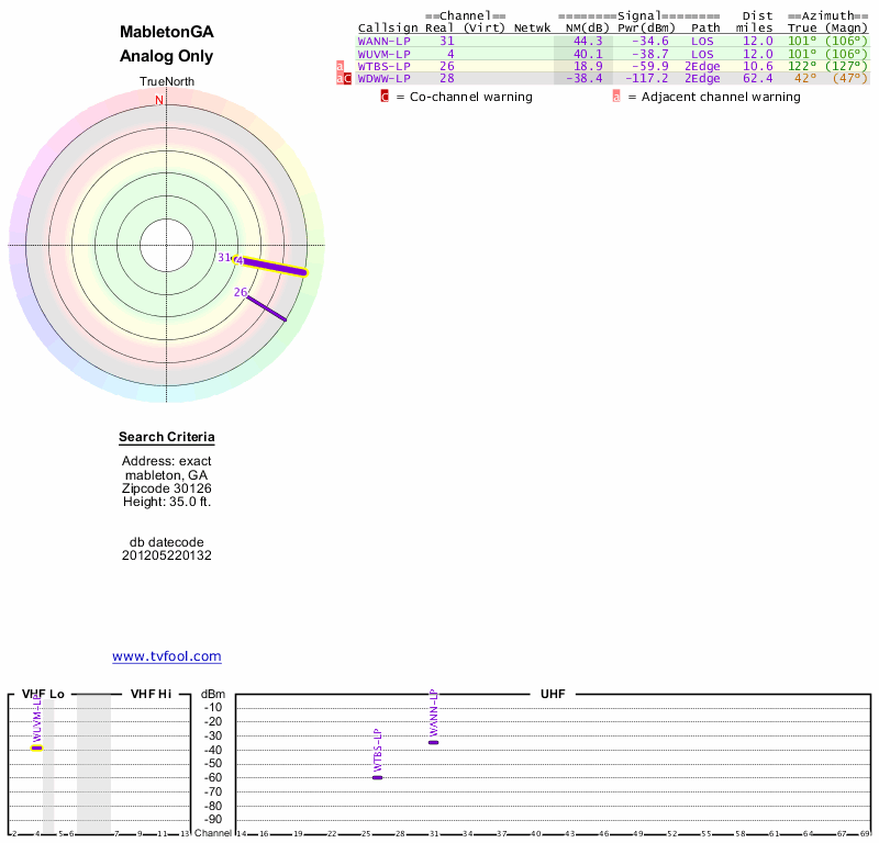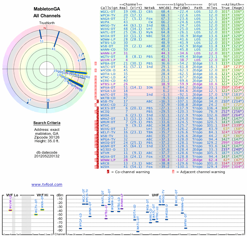 Here are the results for your location. The transmitter database was last updated on June 7, 2013. For more information about these plots and how to interpret them, please check out the Signal Analysis FAQ.
