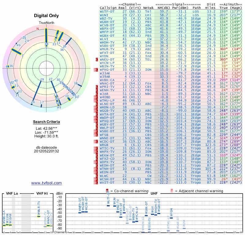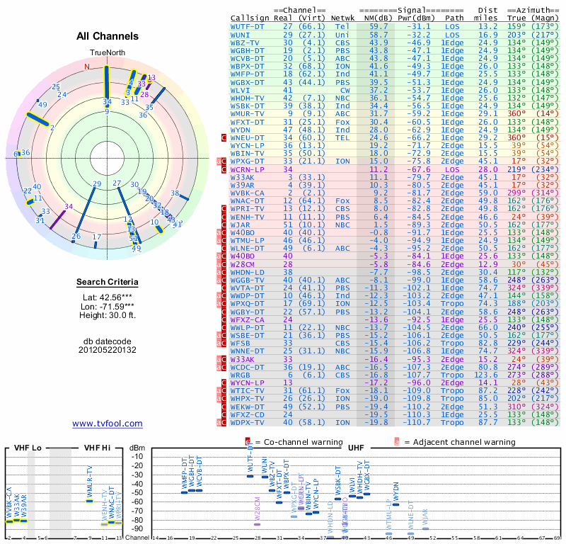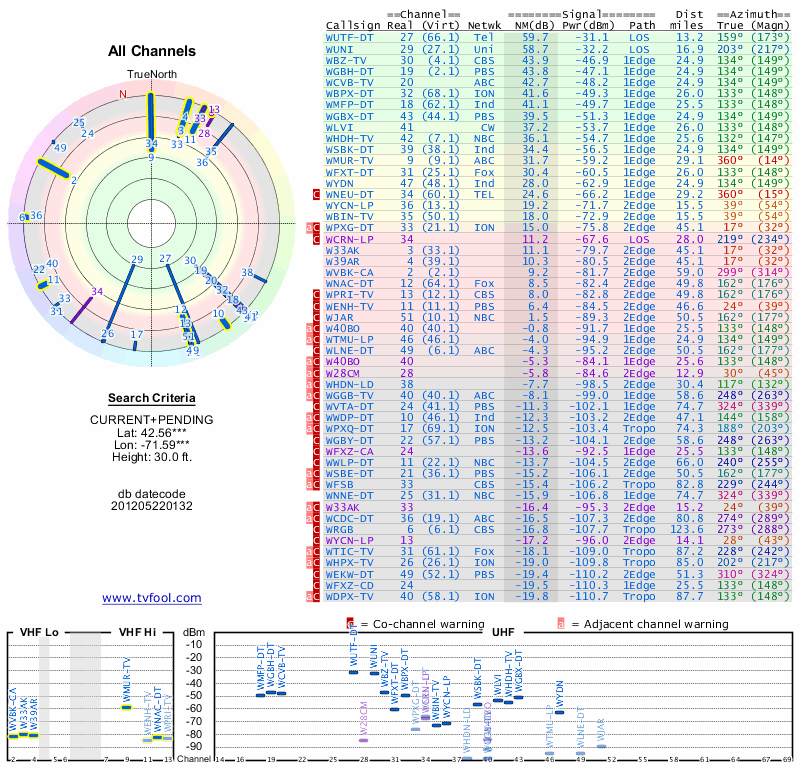 Here are the results for your location. The transmitter database was last updated on June 7, 2013. For more information about these plots and how to interpret them, please check out the Signal Analysis FAQ.