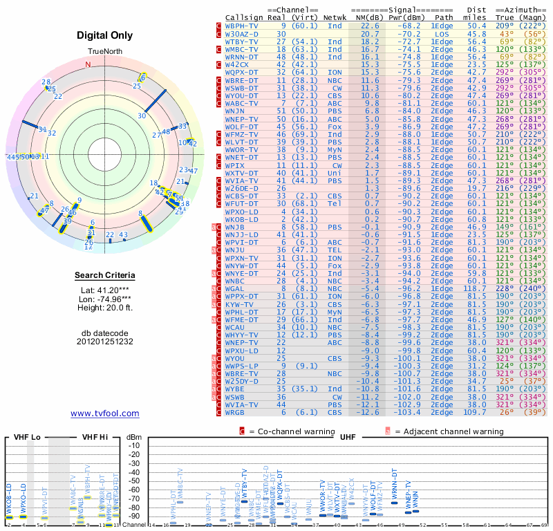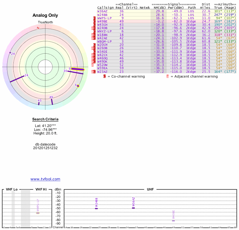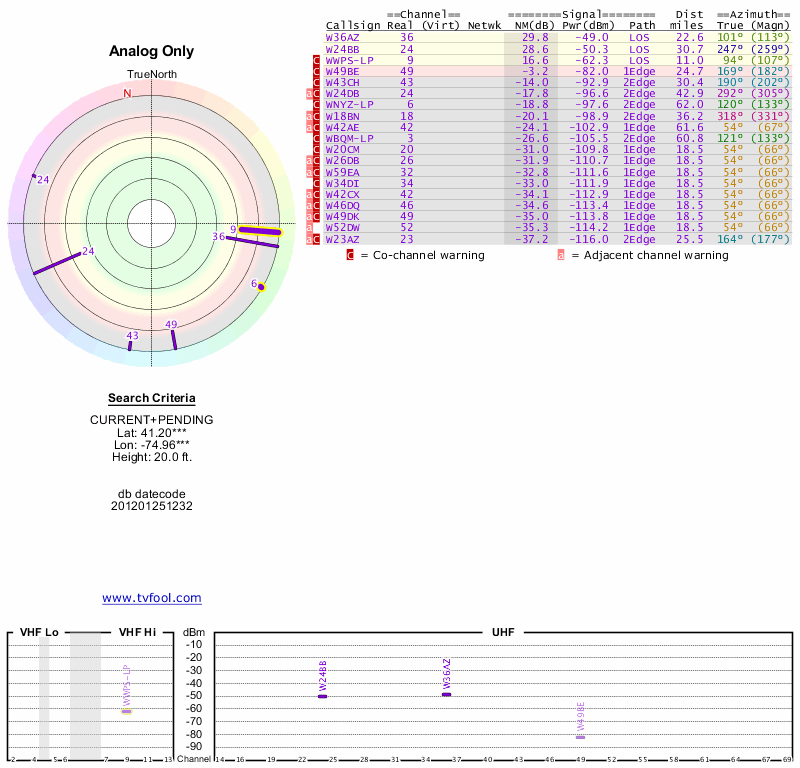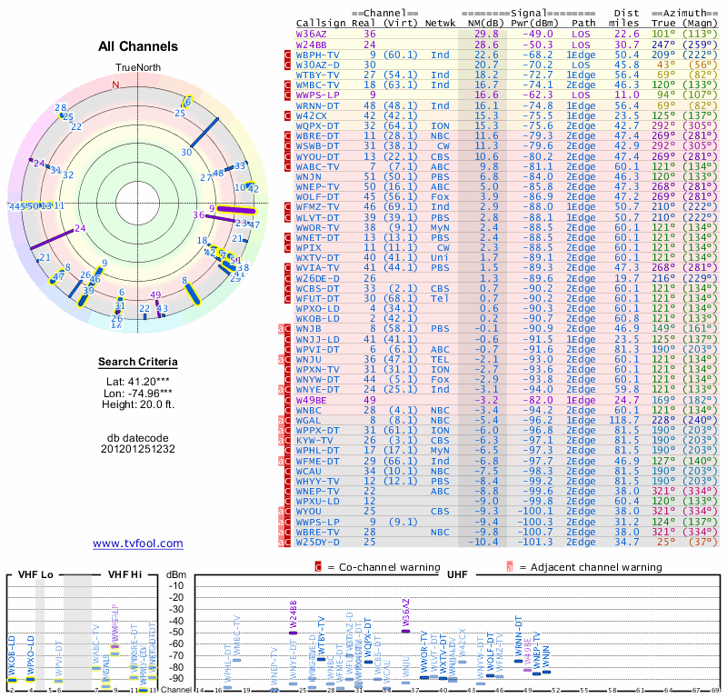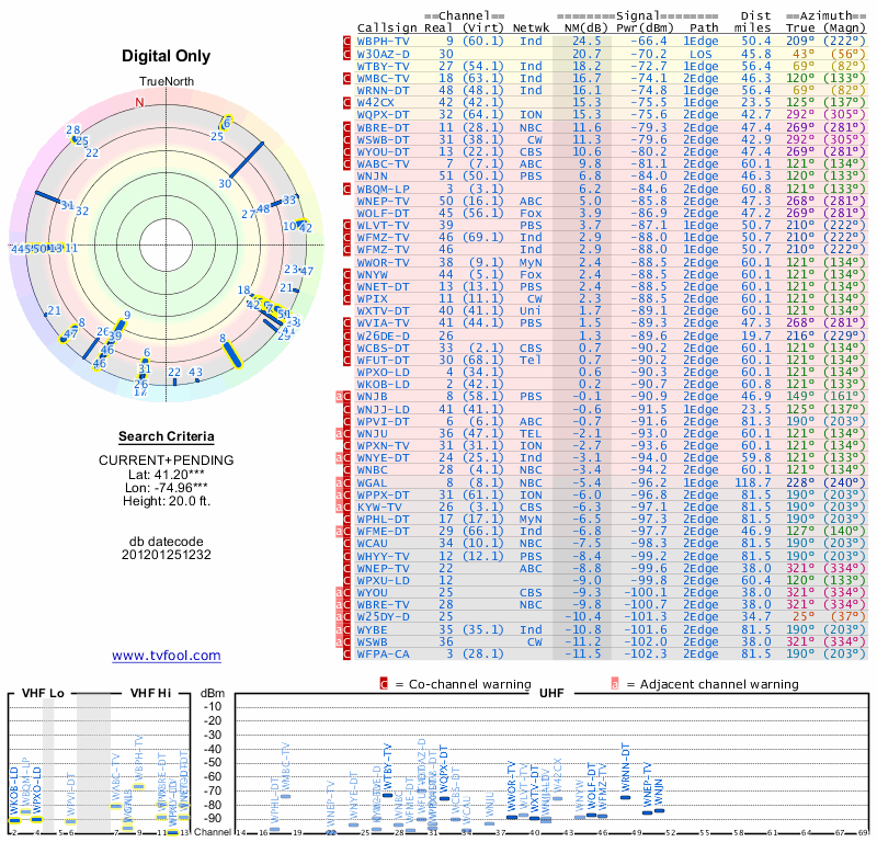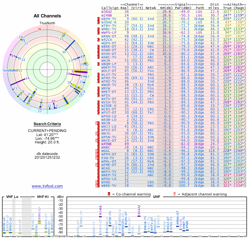 Here are the results for your location. The transmitter database was last updated on June 7, 2013. For more information about these plots and how to interpret them, please check out the Signal Analysis FAQ.