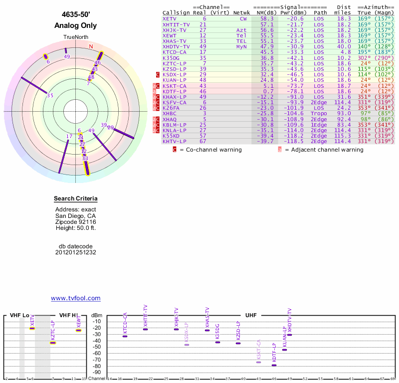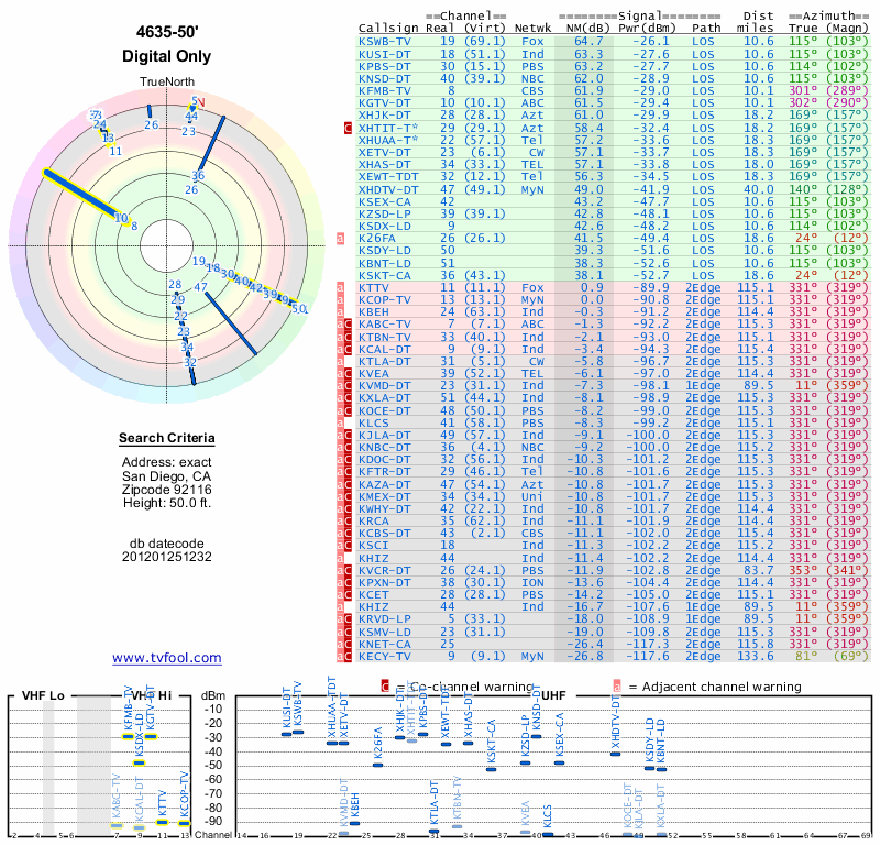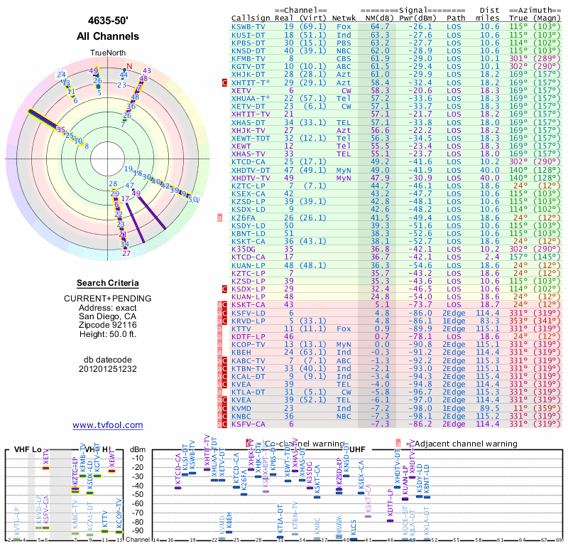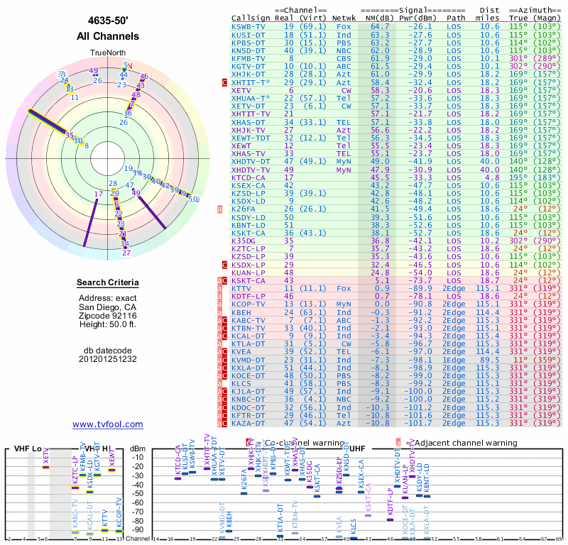 Here are the results for your location. The transmitter database was last updated on June 7, 2013. For more information about these plots and how to interpret them, please check out the Signal Analysis FAQ.