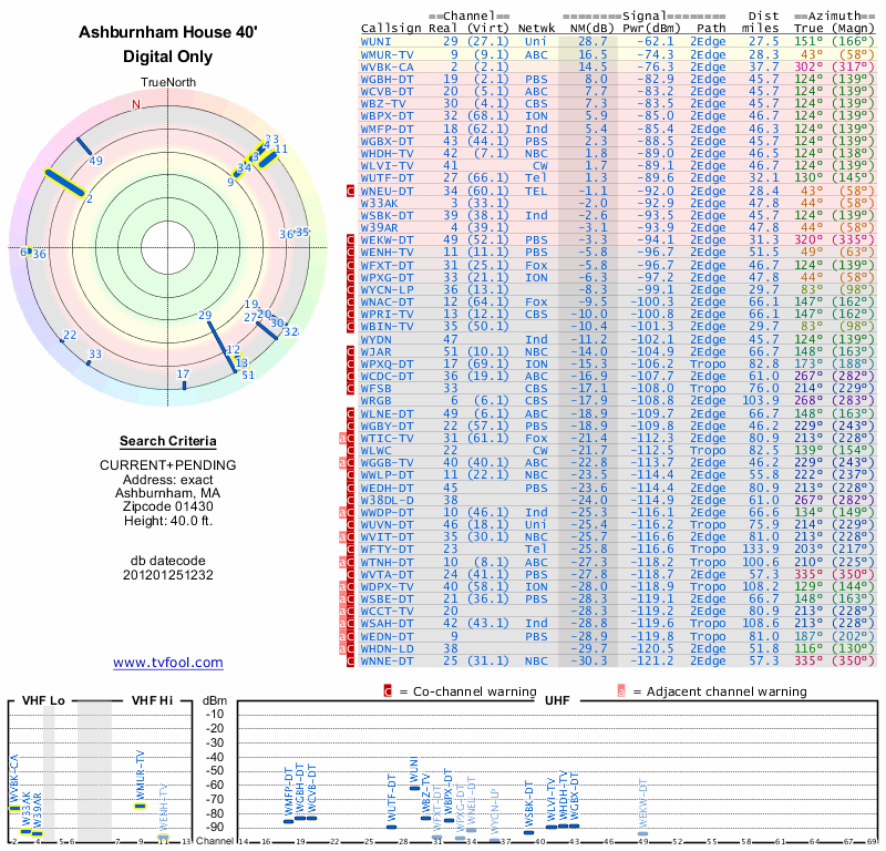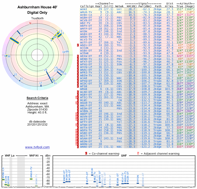 Here are the results for your location. The transmitter database was last updated on June 7, 2013. For more information about these plots and how to interpret them, please check out the Signal Analysis FAQ.