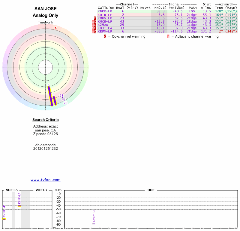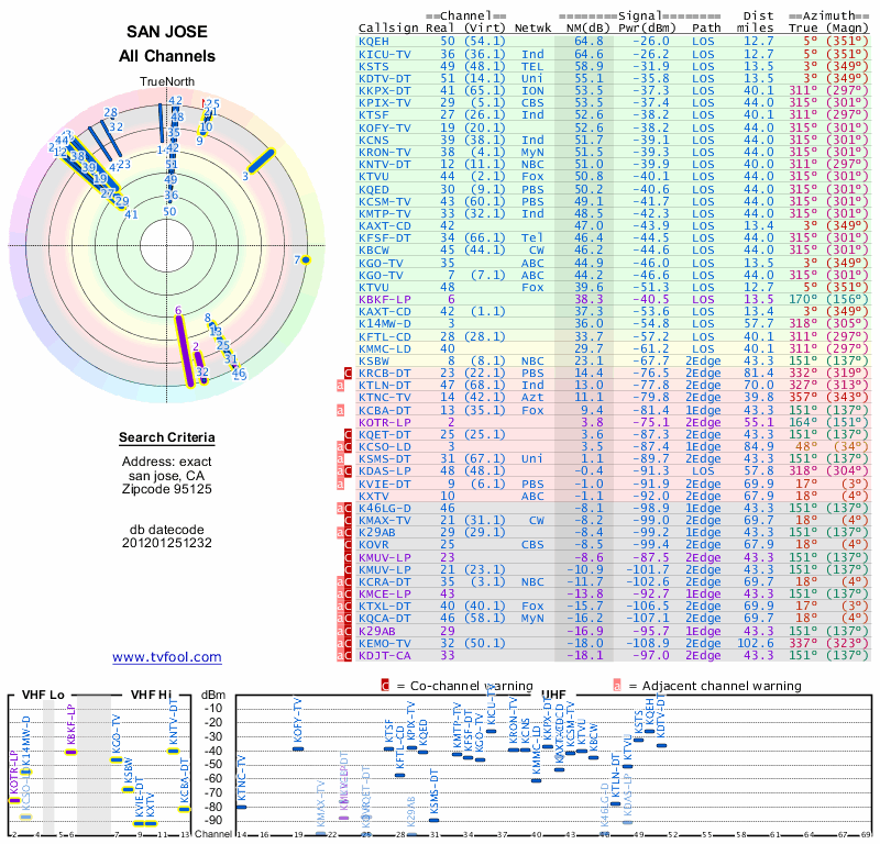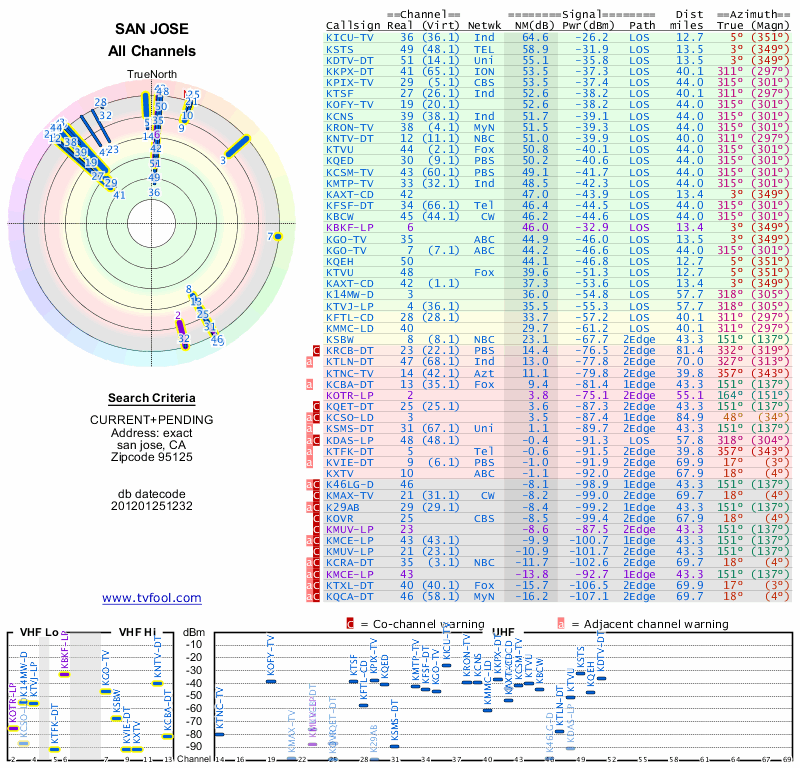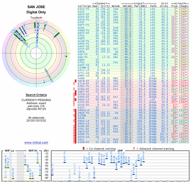 Here are the results for your location. The transmitter database was last updated on June 7, 2013. For more information about these plots and how to interpret them, please check out the Signal Analysis FAQ.