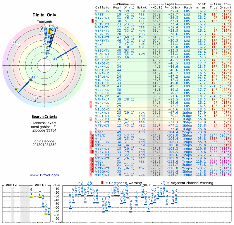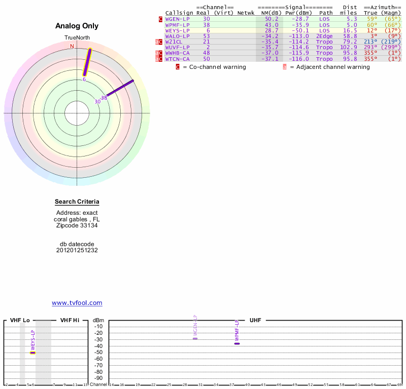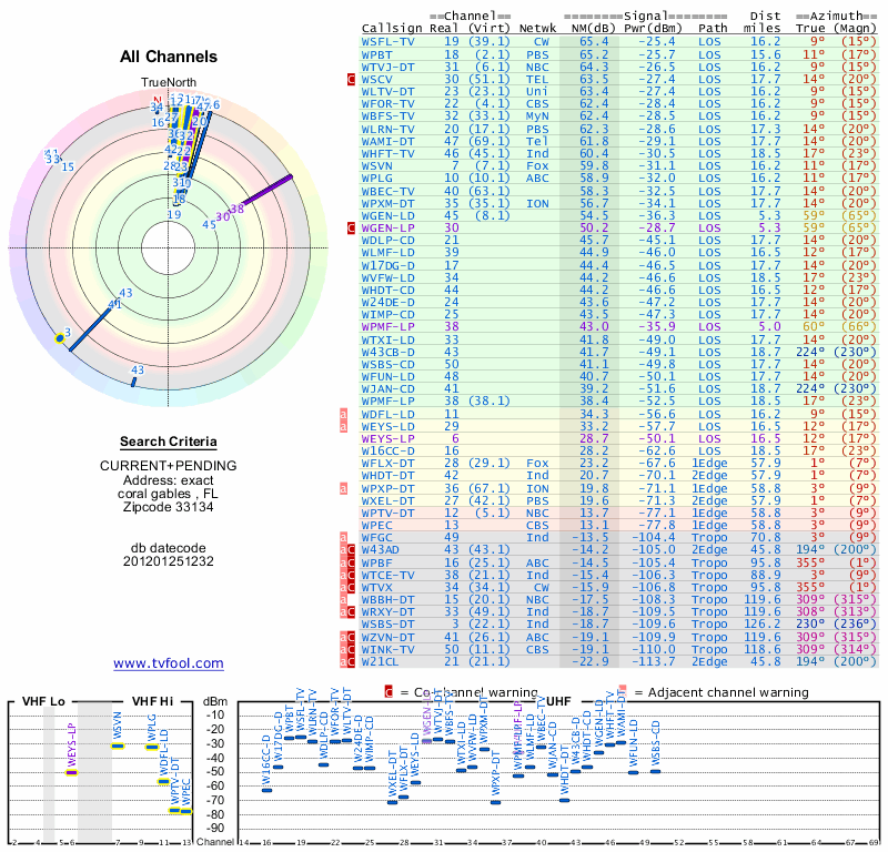 Here are the results for your location. The transmitter database was last updated on June 7, 2013. For more information about these plots and how to interpret them, please check out the Signal Analysis FAQ.