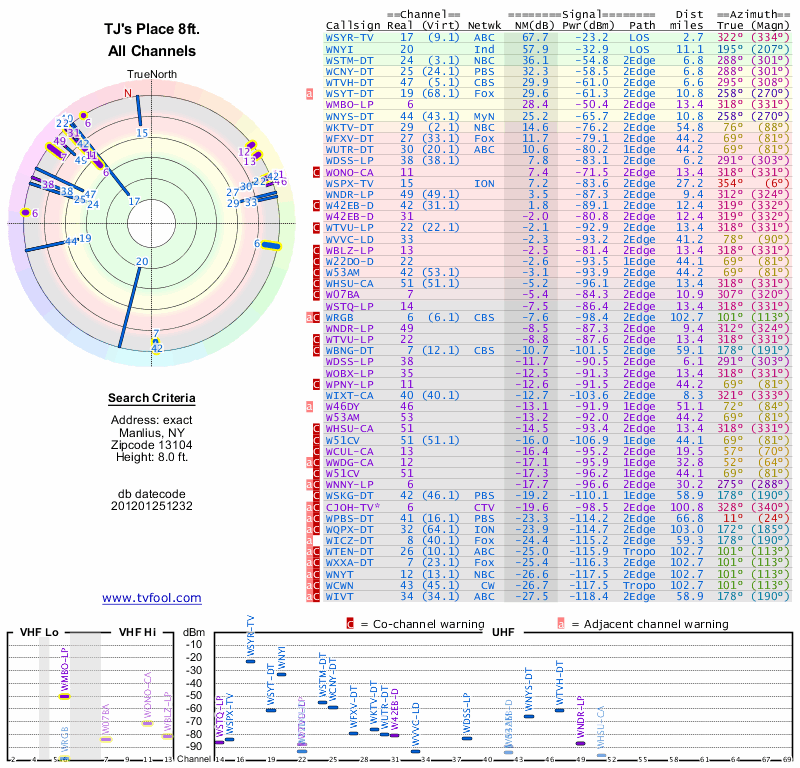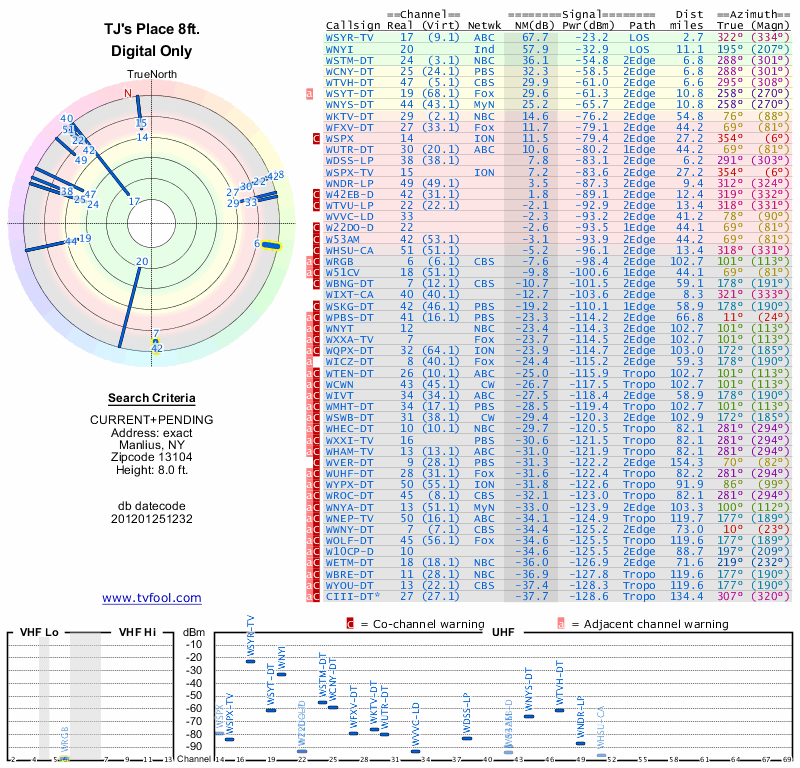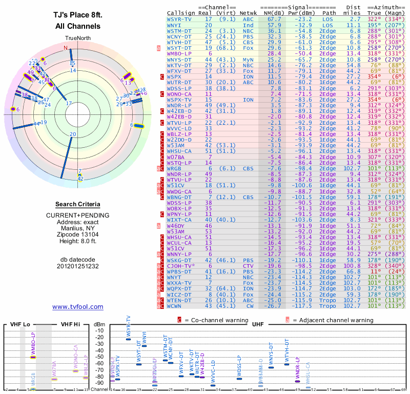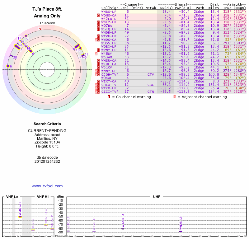 Here are the results for your location. The transmitter database was last updated on June 7, 2013. For more information about these plots and how to interpret them, please check out the Signal Analysis FAQ.