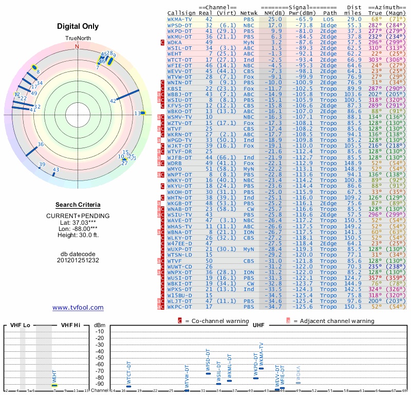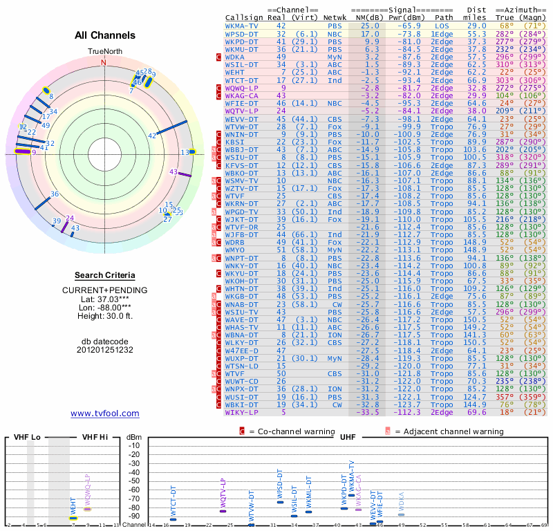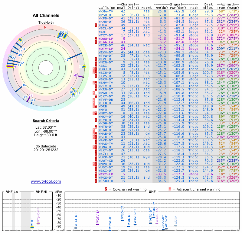 Here are the results for your location. The transmitter database was last updated on June 7, 2013. For more information about these plots and how to interpret them, please check out the Signal Analysis FAQ.