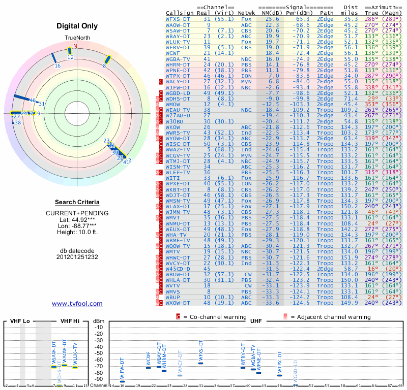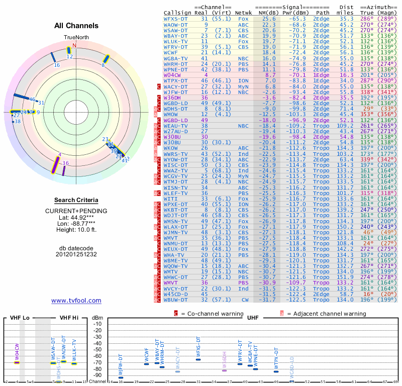 Here are the results for your location. The transmitter database was last updated on June 7, 2013. For more information about these plots and how to interpret them, please check out the Signal Analysis FAQ.