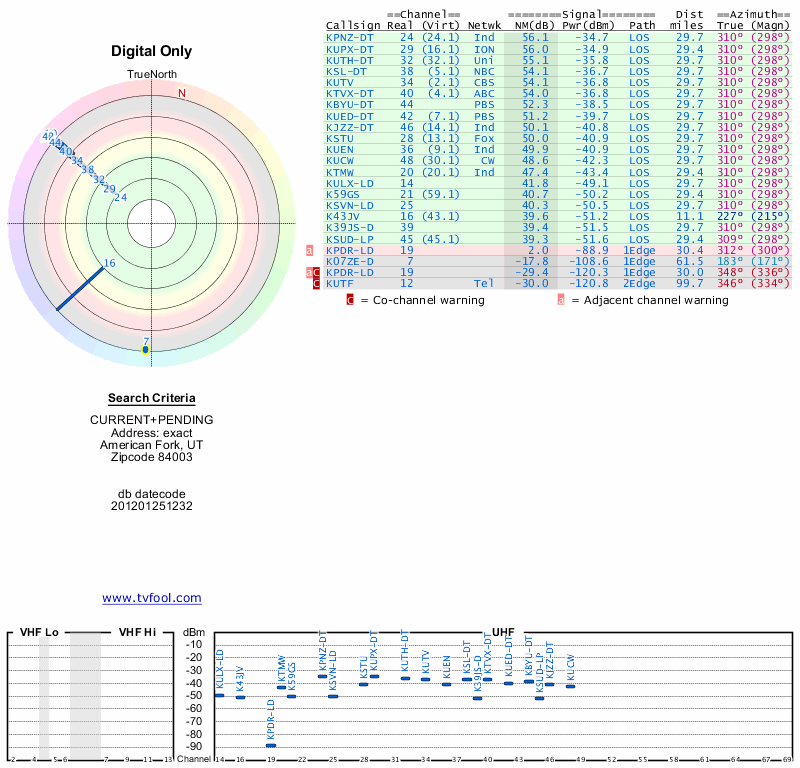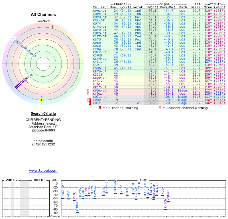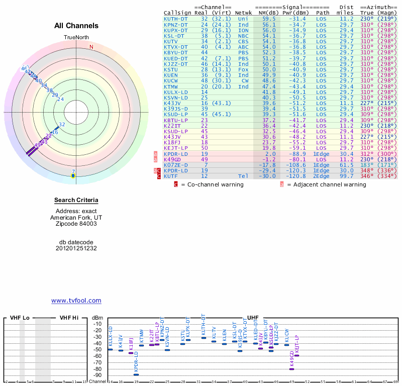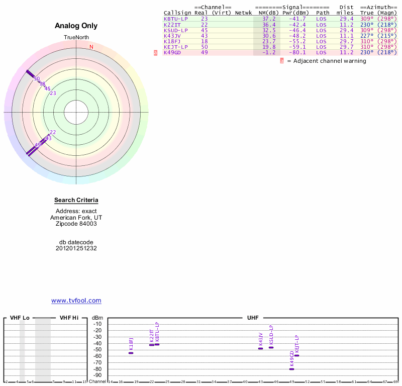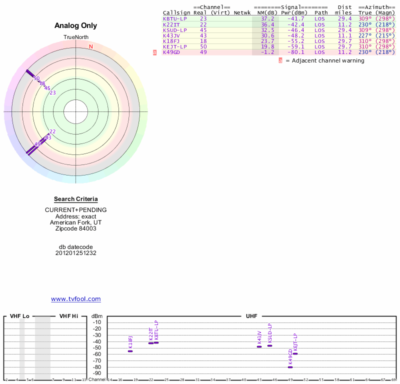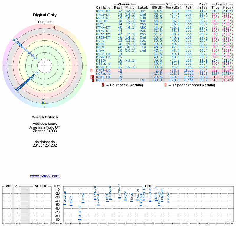 Here are the results for your location. The transmitter database was last updated on June 7, 2013. For more information about these plots and how to interpret them, please check out the Signal Analysis FAQ.