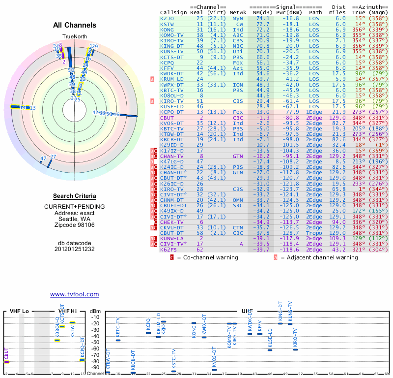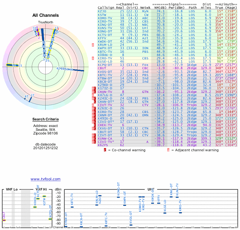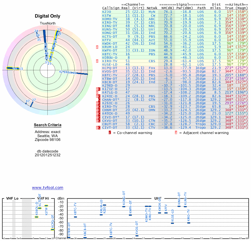 Here are the results for your location. The transmitter database was last updated on June 7, 2013. For more information about these plots and how to interpret them, please check out the Signal Analysis FAQ.