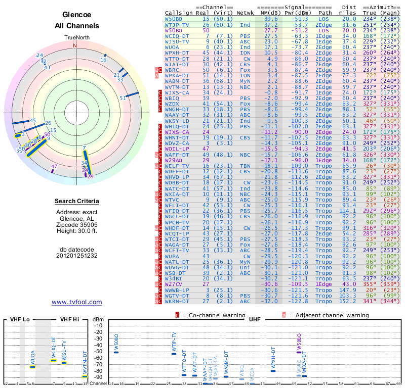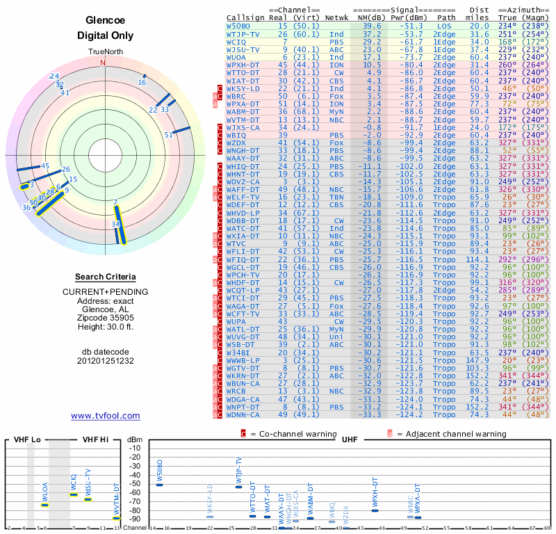 Here are the results for your location. The transmitter database was last updated on June 7, 2013. For more information about these plots and how to interpret them, please check out the Signal Analysis FAQ.