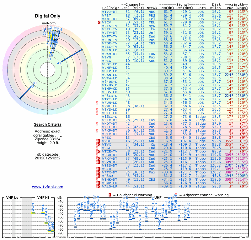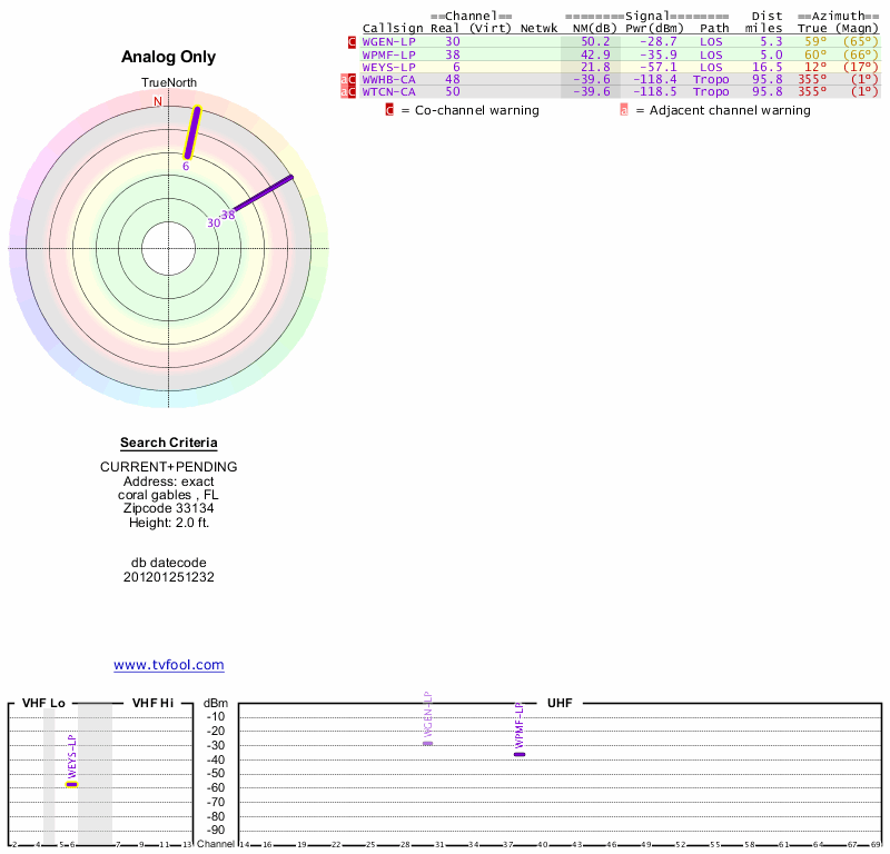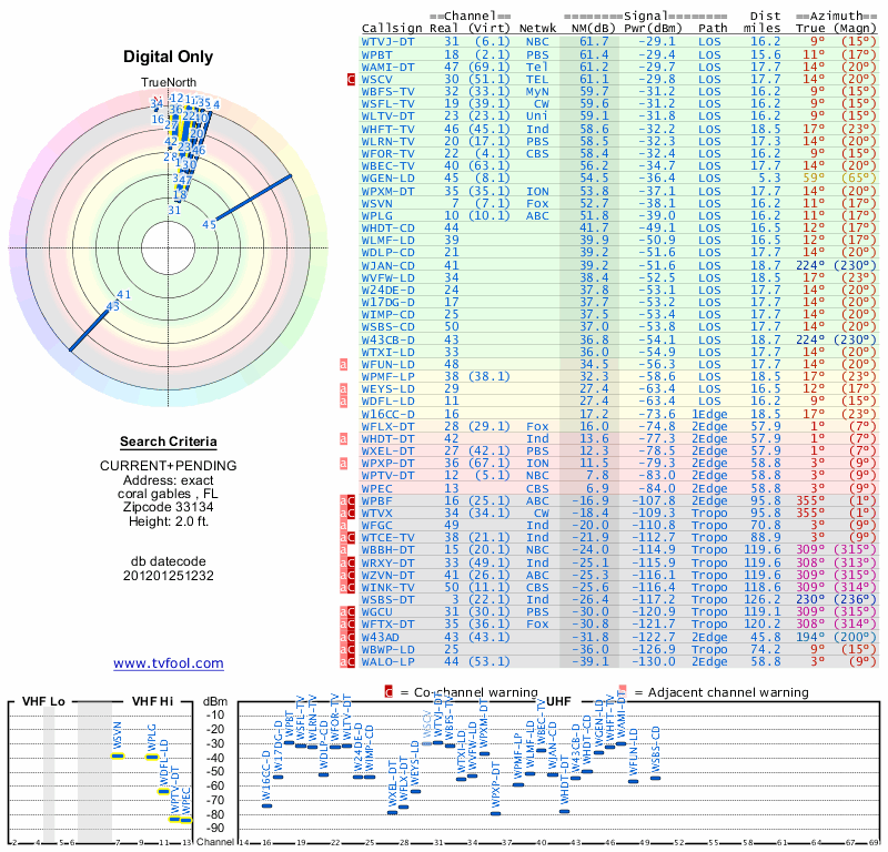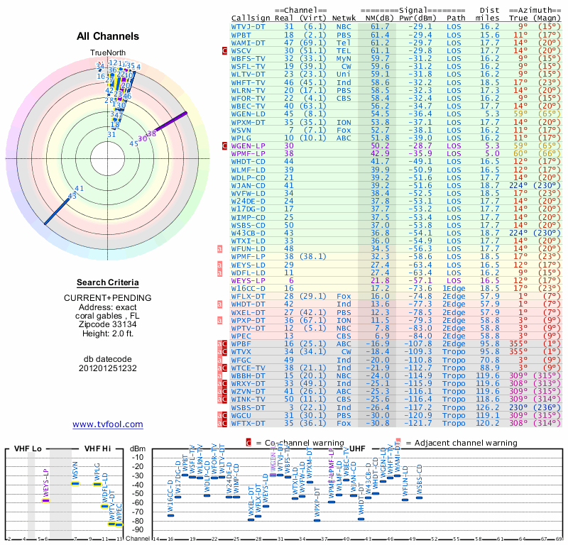 Here are the results for your location. The transmitter database was last updated on June 7, 2013. For more information about these plots and how to interpret them, please check out the Signal Analysis FAQ.