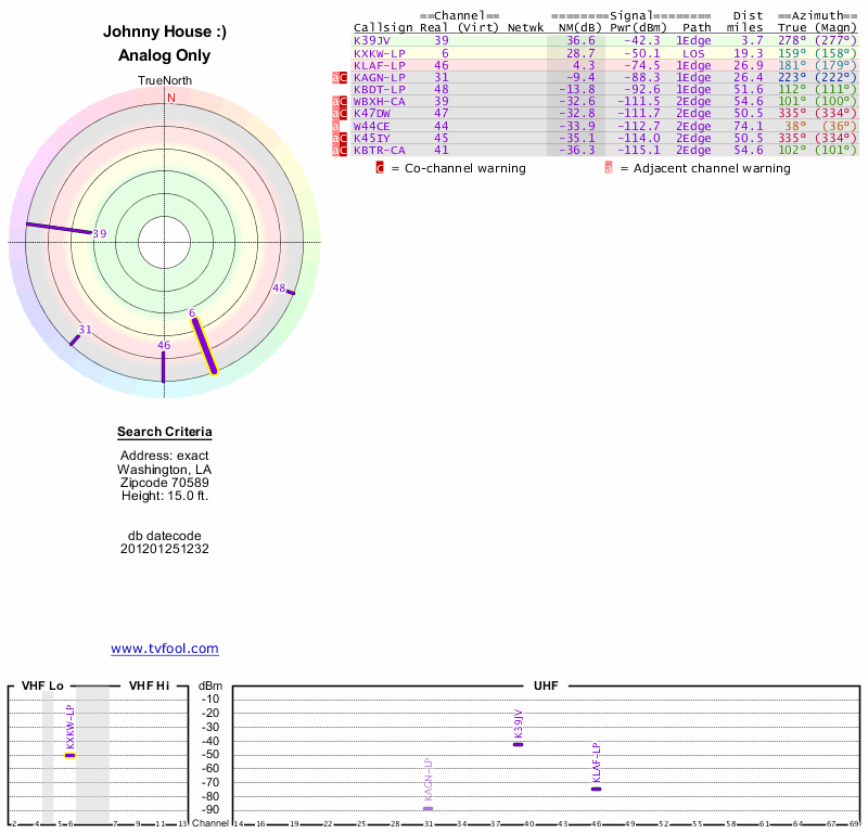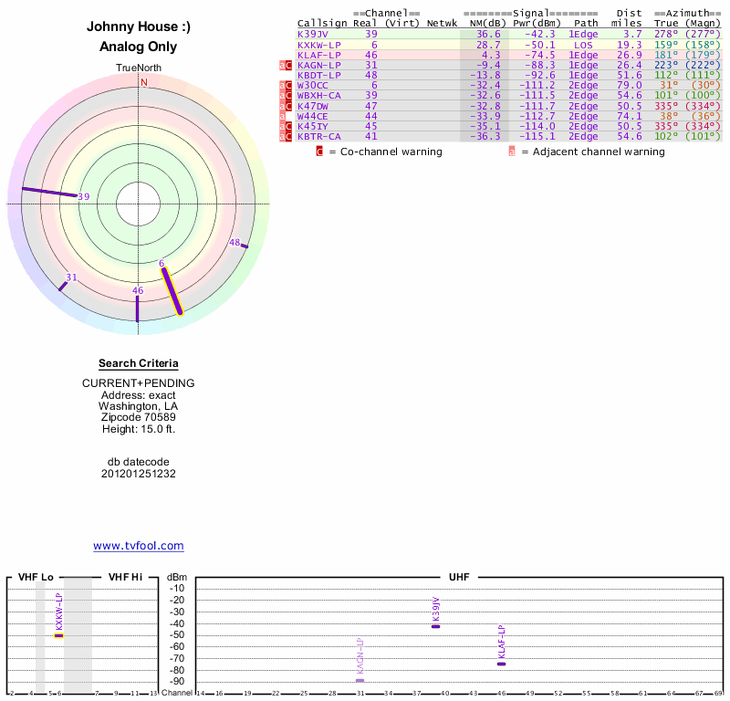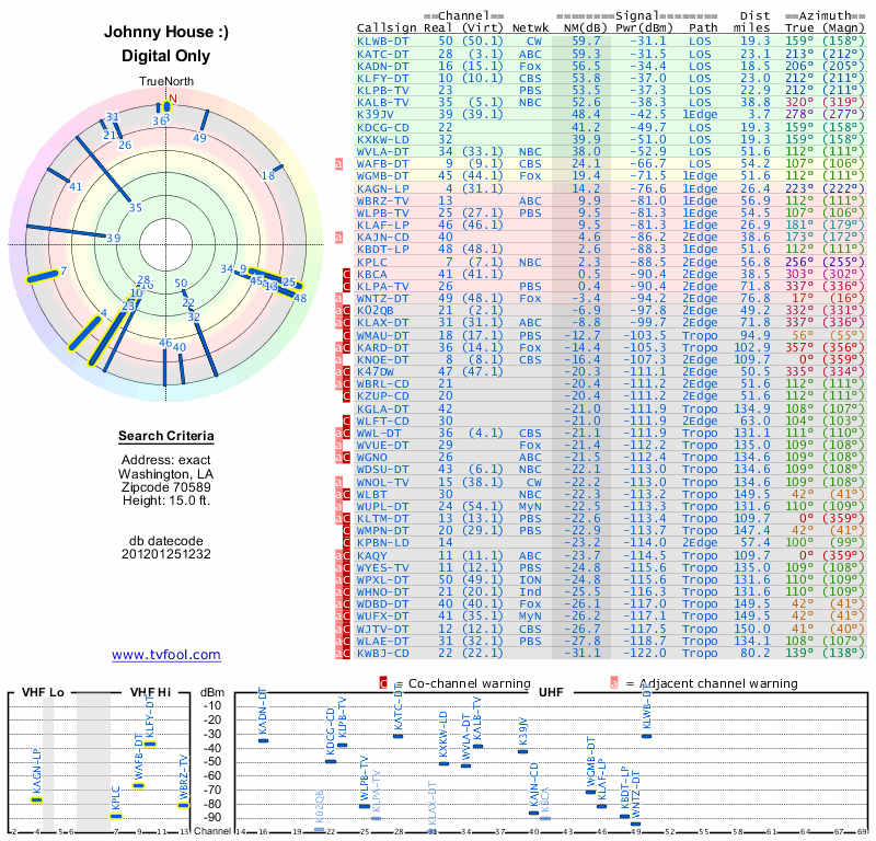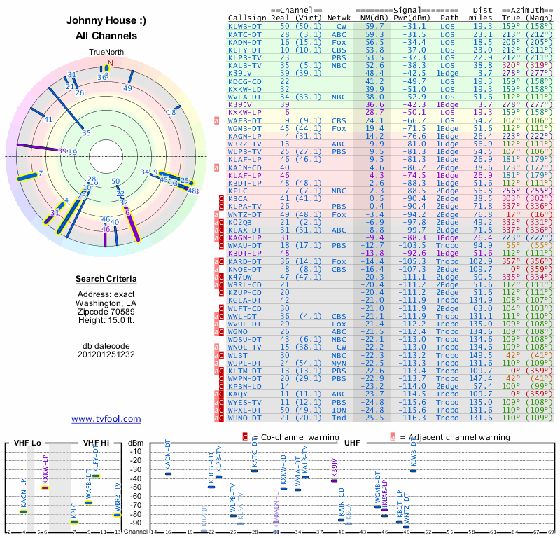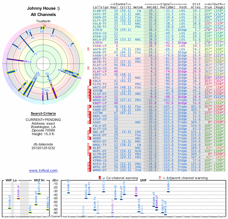 Here are the results for your location. The transmitter database was last updated on June 7, 2013. For more information about these plots and how to interpret them, please check out the Signal Analysis FAQ.