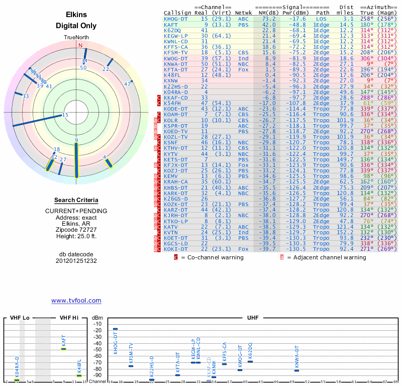 Here are the results for your location. The transmitter database was last updated on June 7, 2013. For more information about these plots and how to interpret them, please check out the Signal Analysis FAQ.