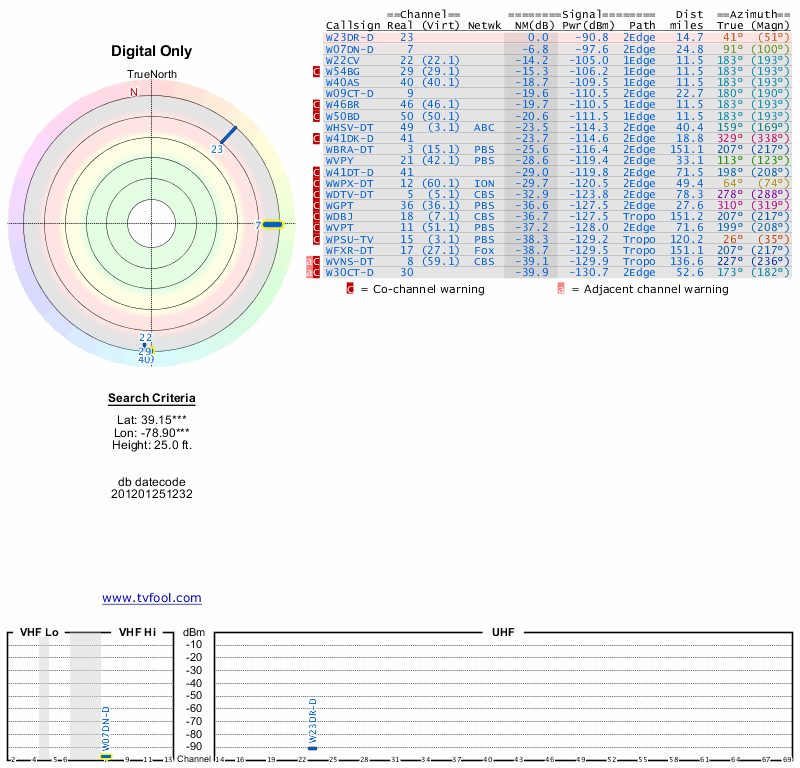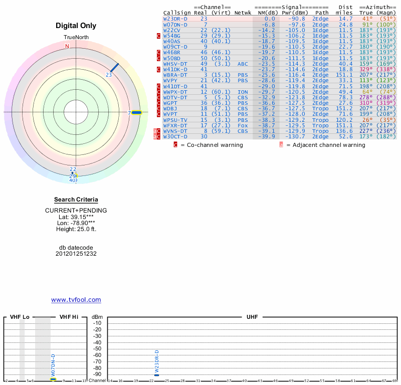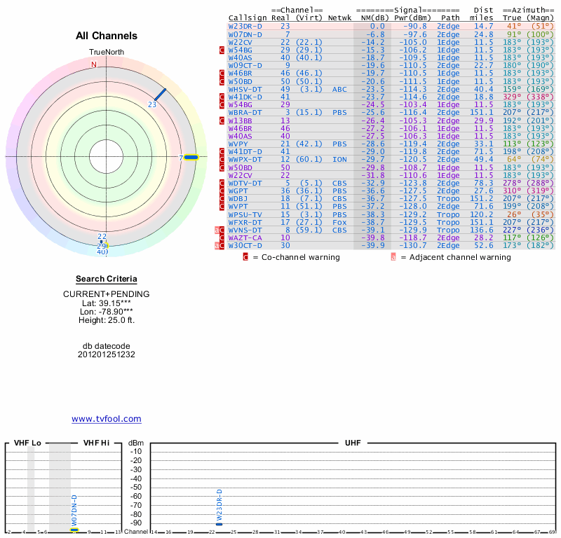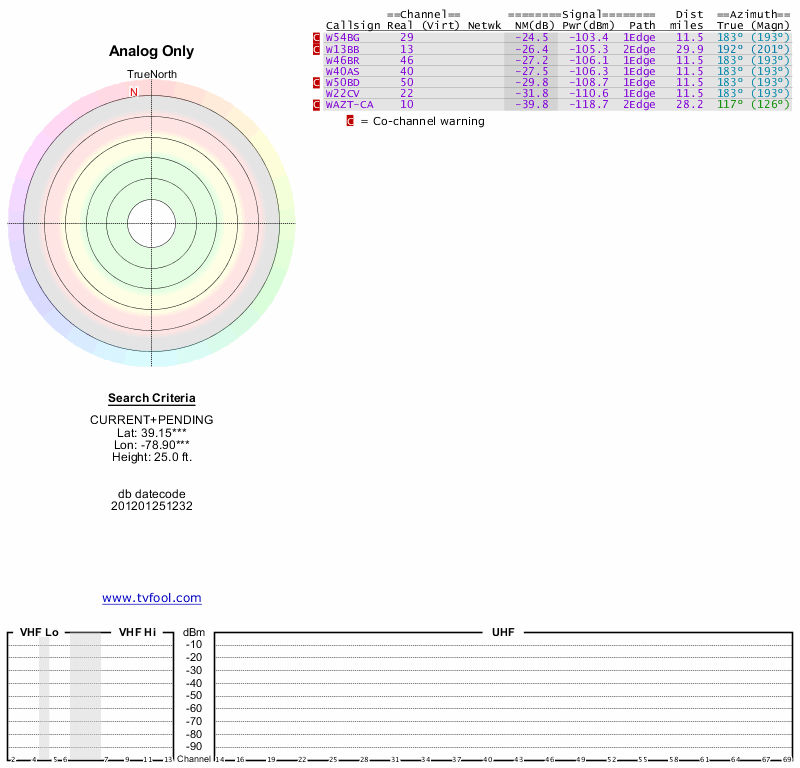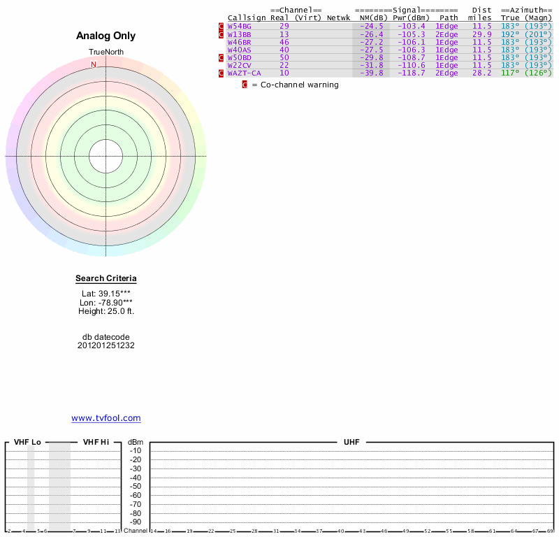 Here are the results for your location. The transmitter database was last updated on June 7, 2013. For more information about these plots and how to interpret them, please check out the Signal Analysis FAQ.