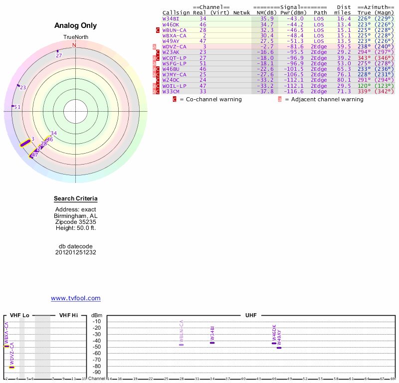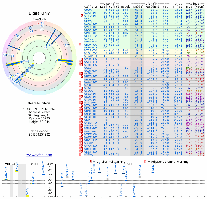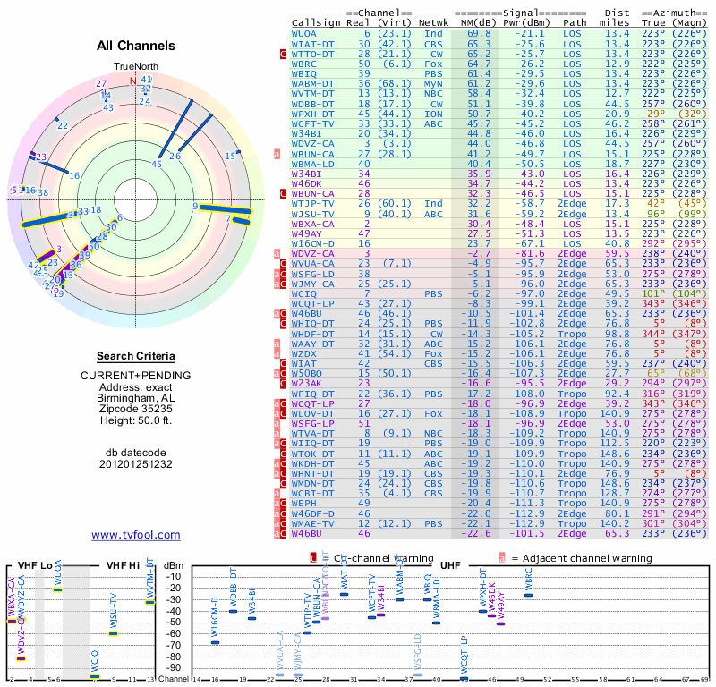 Here are the results for your location. The transmitter database was last updated on June 7, 2013. For more information about these plots and how to interpret them, please check out the Signal Analysis FAQ.