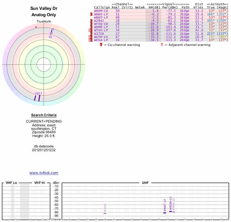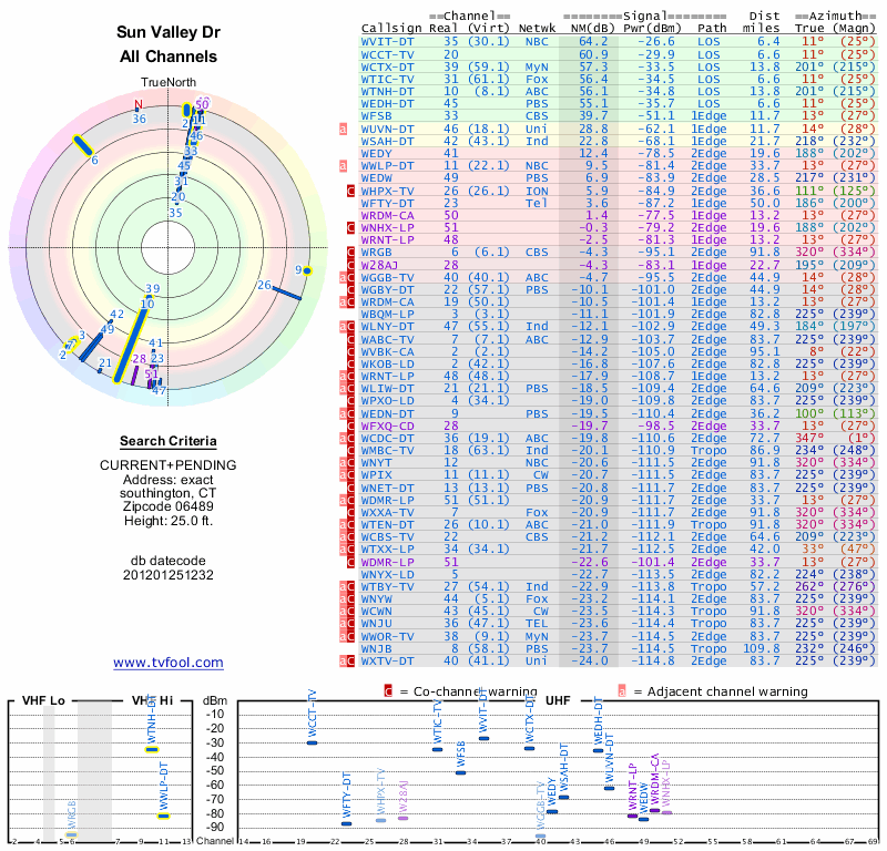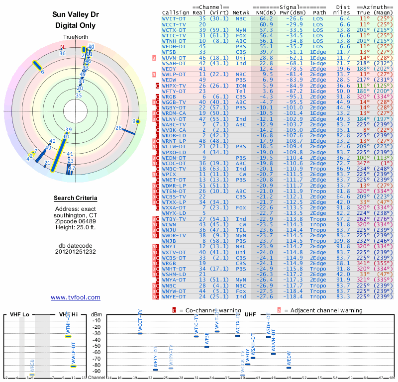 Here are the results for your location. The transmitter database was last updated on June 7, 2013. For more information about these plots and how to interpret them, please check out the Signal Analysis FAQ.