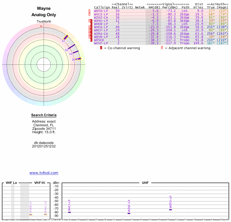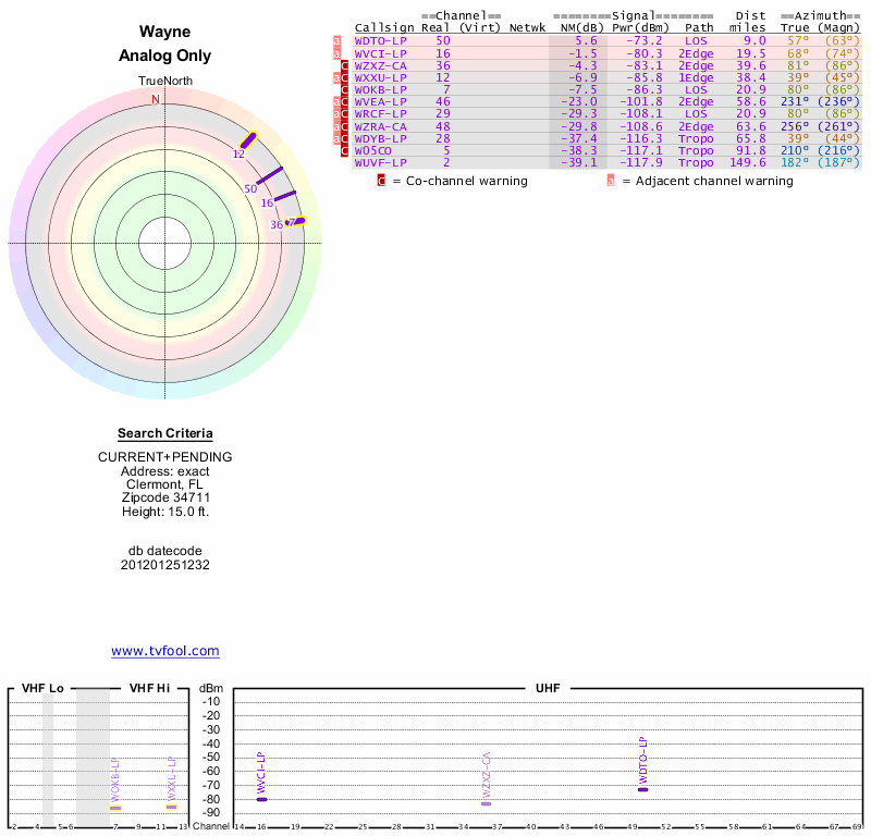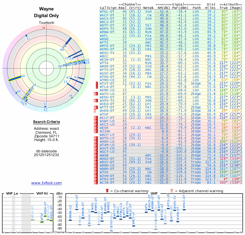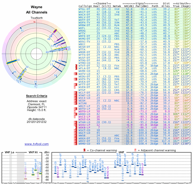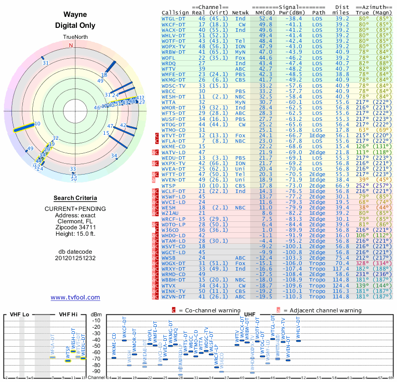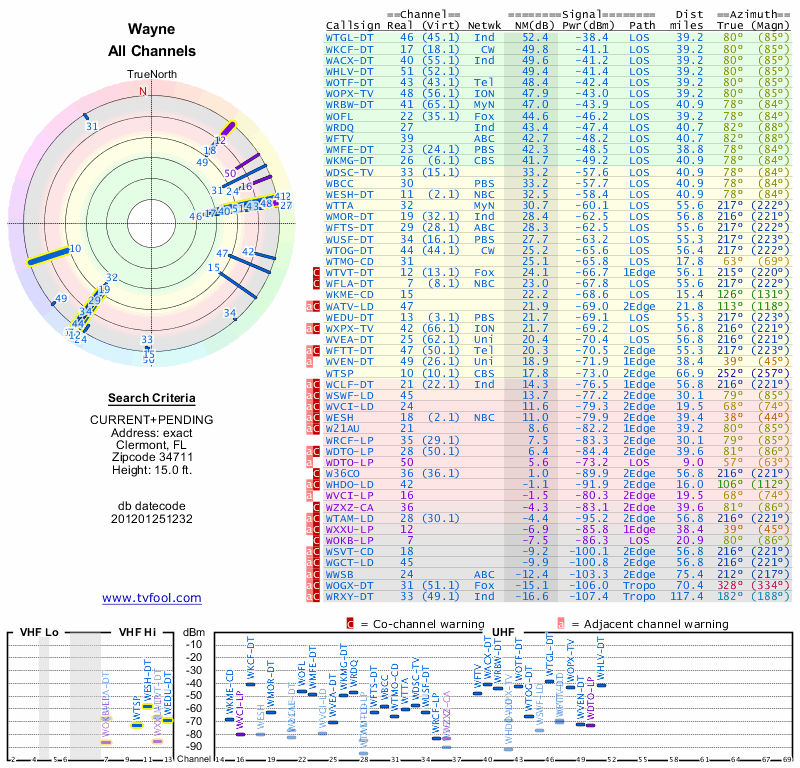 Here are the results for your location. The transmitter database was last updated on June 7, 2013. For more information about these plots and how to interpret them, please check out the Signal Analysis FAQ.