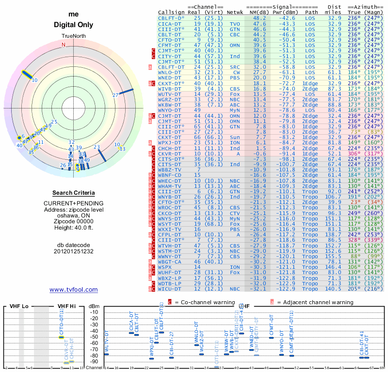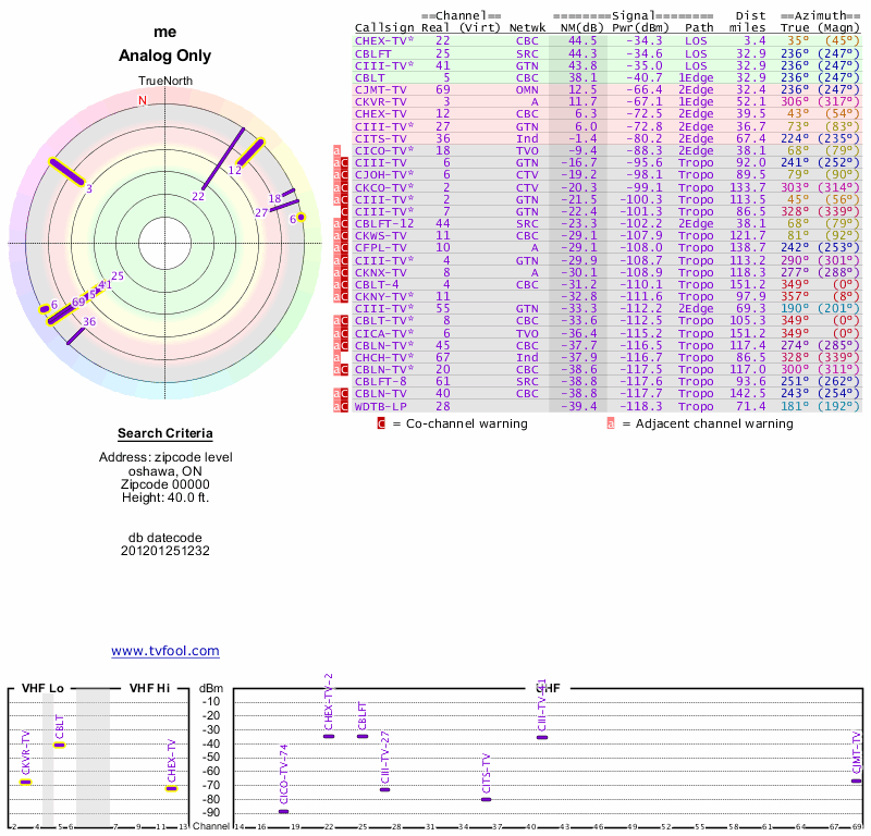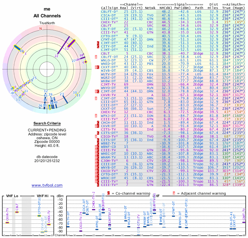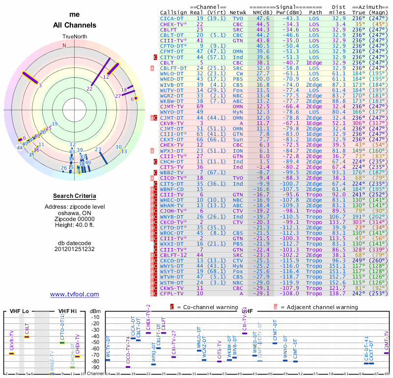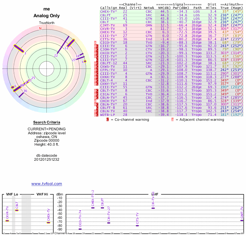 Here are the results for your location. The transmitter database was last updated on June 7, 2013. For more information about these plots and how to interpret them, please check out the Signal Analysis FAQ.