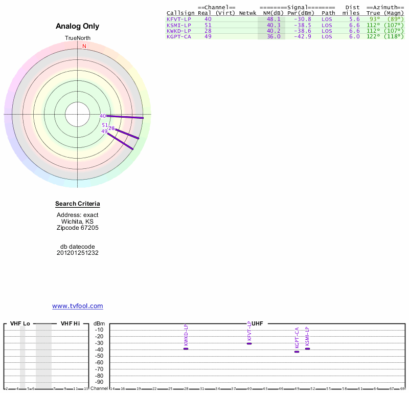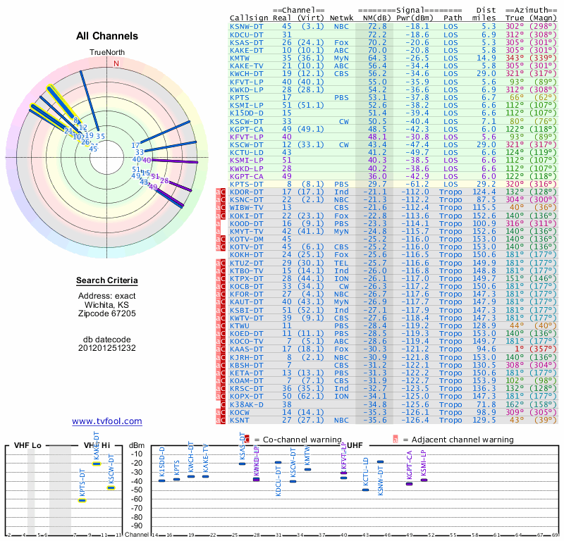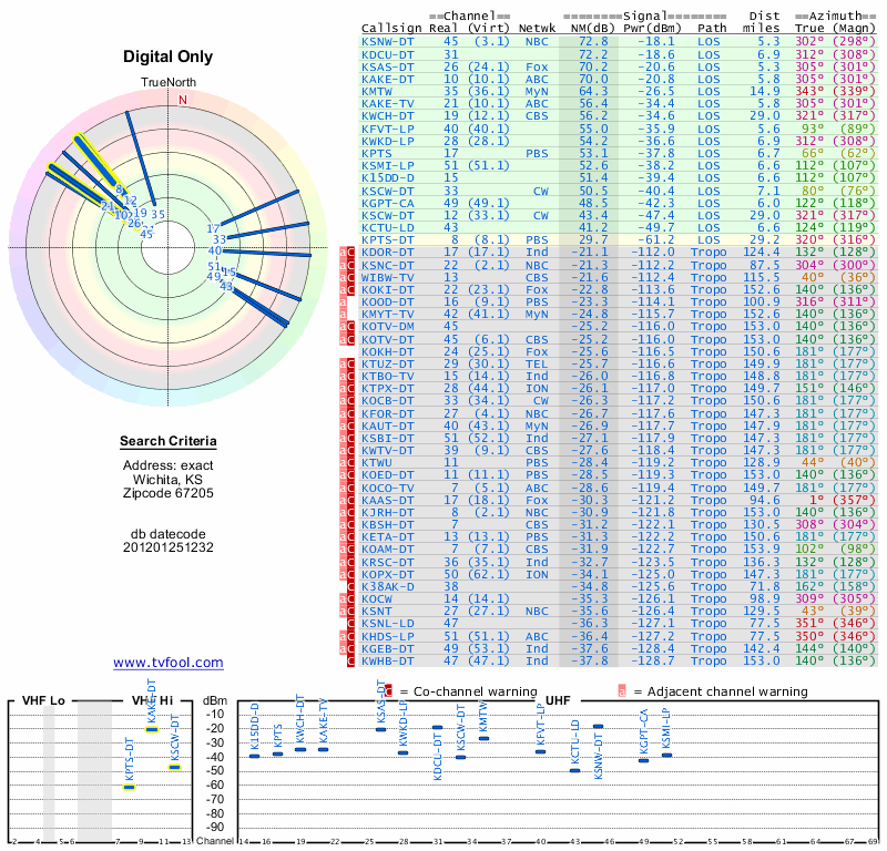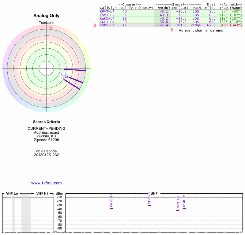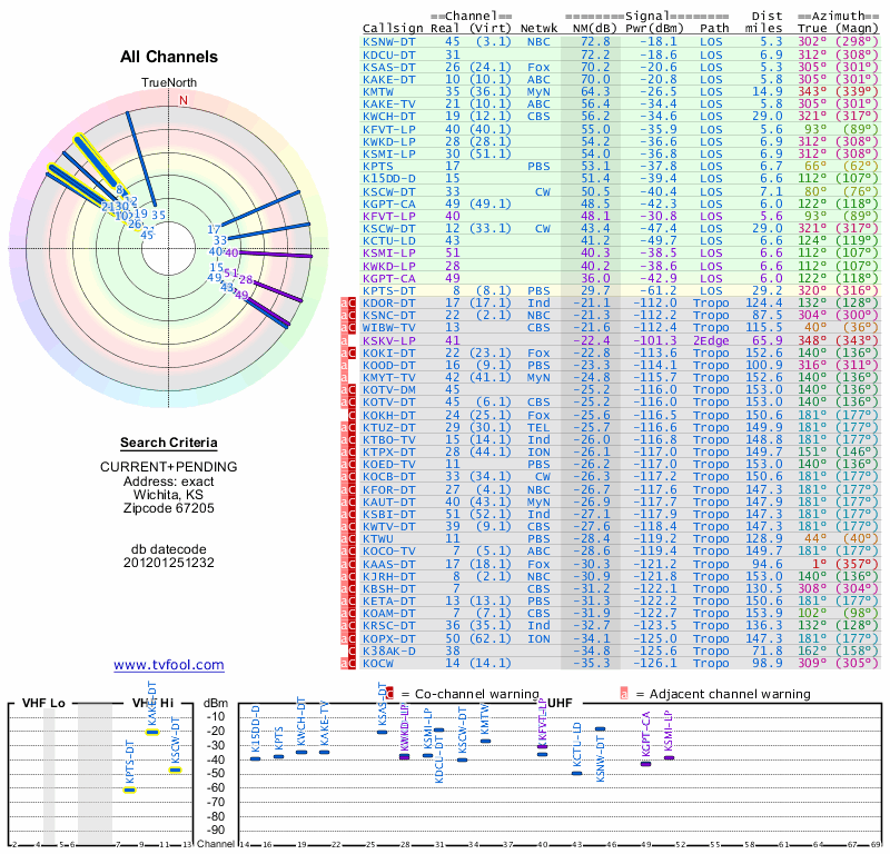 Here are the results for your location. The transmitter database was last updated on June 7, 2013. For more information about these plots and how to interpret them, please check out the Signal Analysis FAQ.