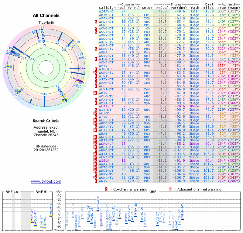 Here are the results for your location. The transmitter database was last updated on June 7, 2013. For more information about these plots and how to interpret them, please check out the Signal Analysis FAQ.