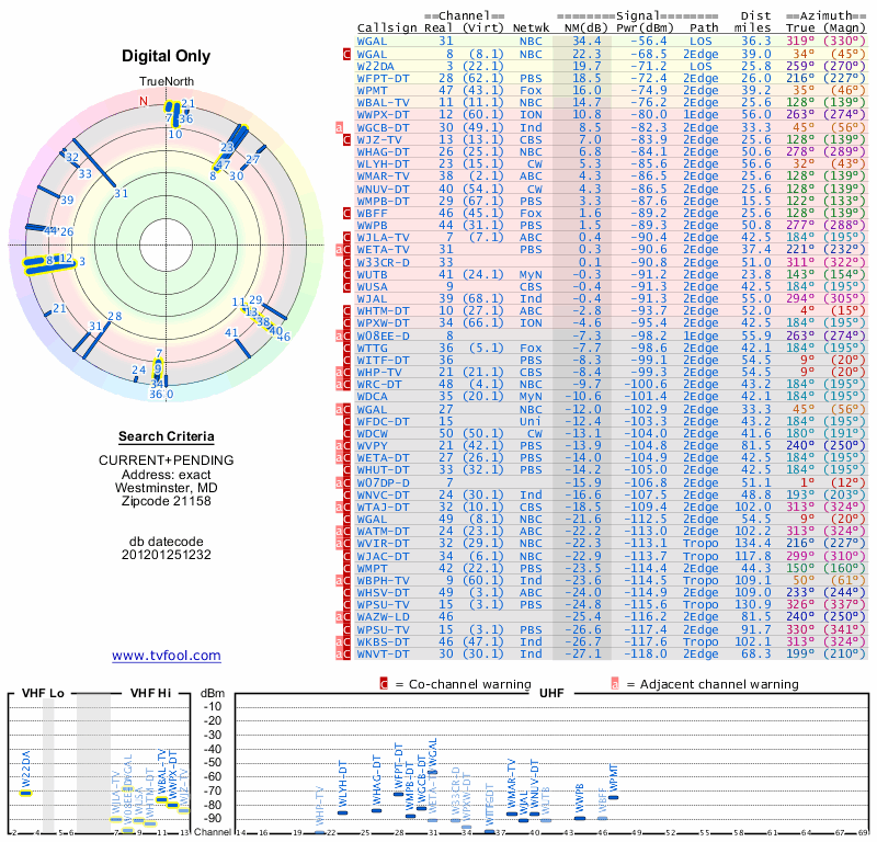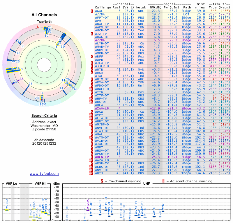 Here are the results for your location. The transmitter database was last updated on June 7, 2013. For more information about these plots and how to interpret them, please check out the Signal Analysis FAQ.