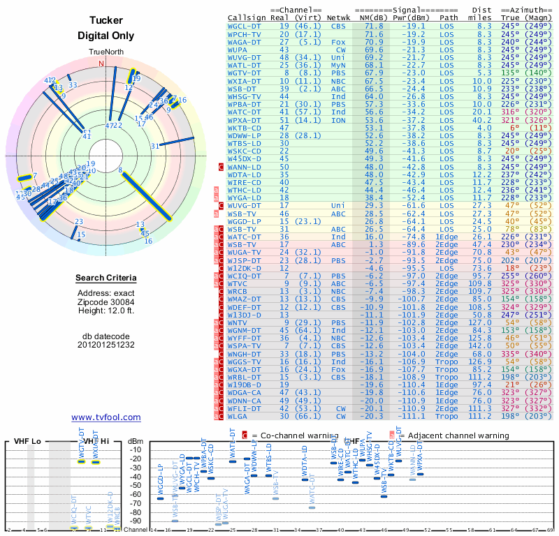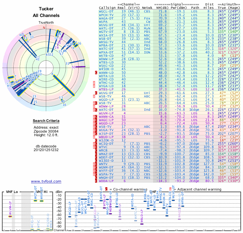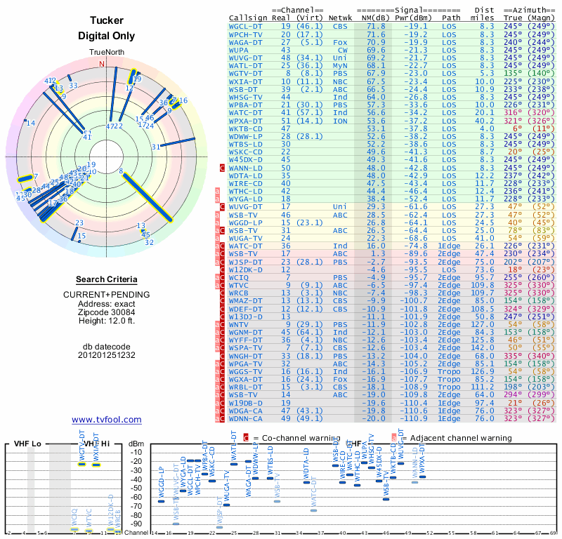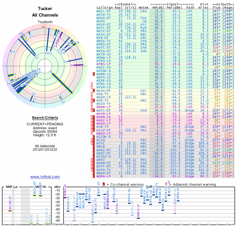 Here are the results for your location. The transmitter database was last updated on June 7, 2013. For more information about these plots and how to interpret them, please check out the Signal Analysis FAQ.