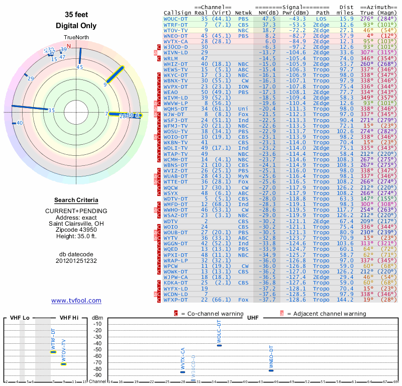 Here are the results for your location. The transmitter database was last updated on June 7, 2013. For more information about these plots and how to interpret them, please check out the Signal Analysis FAQ.