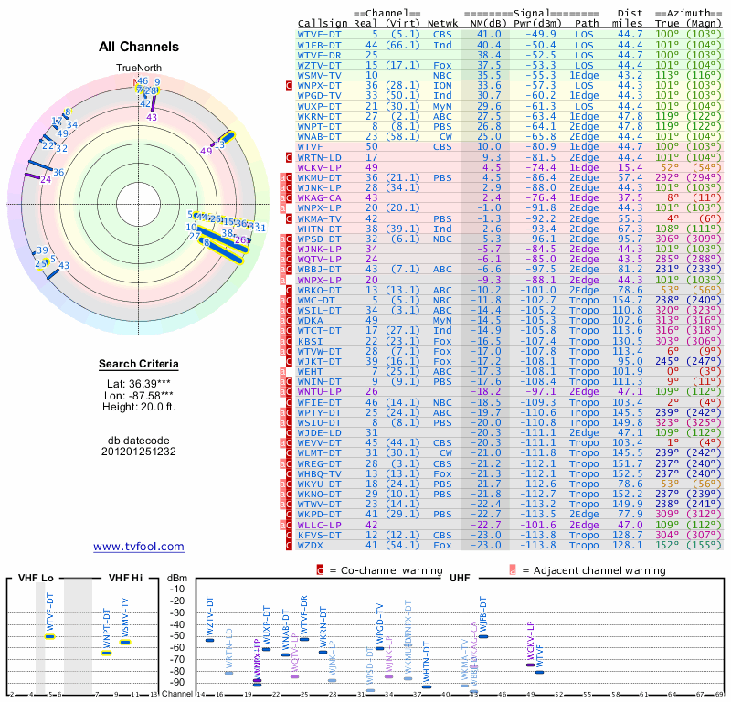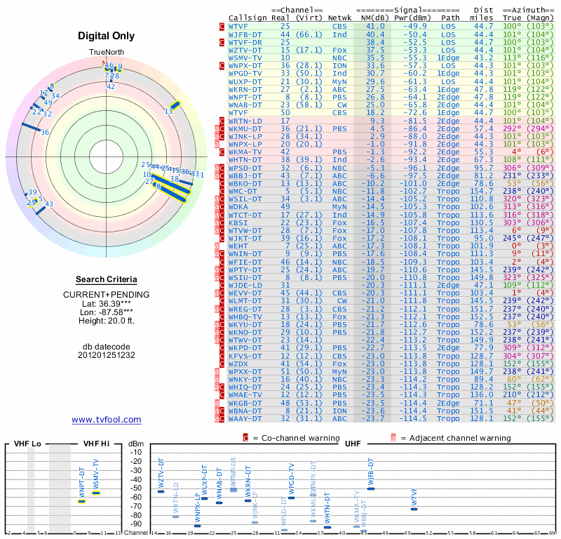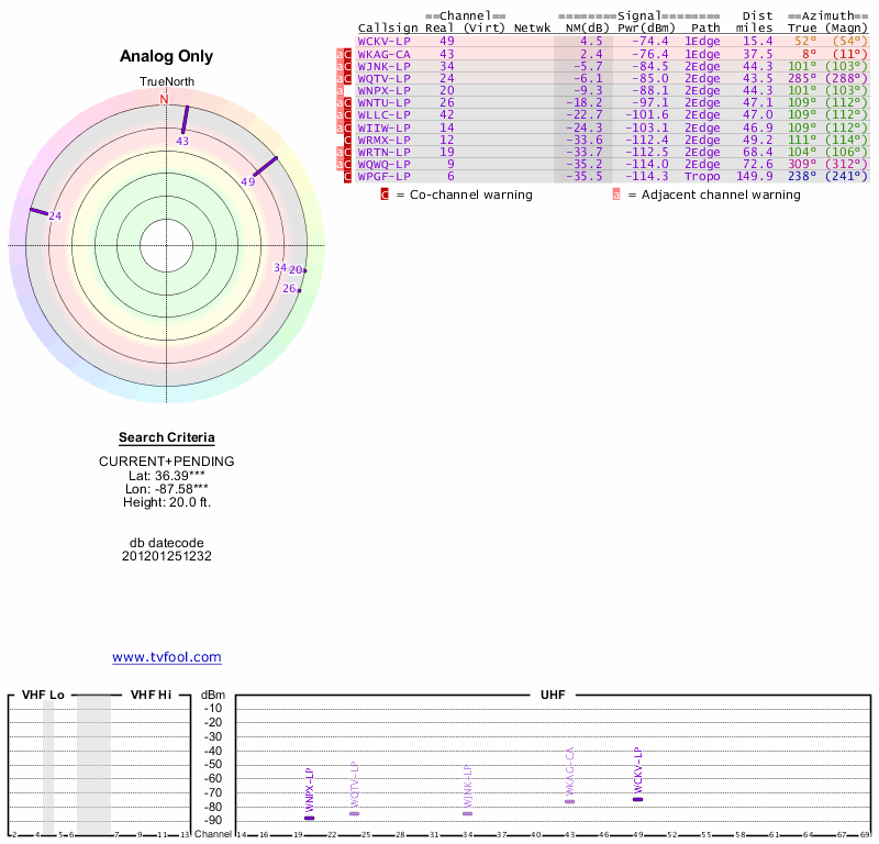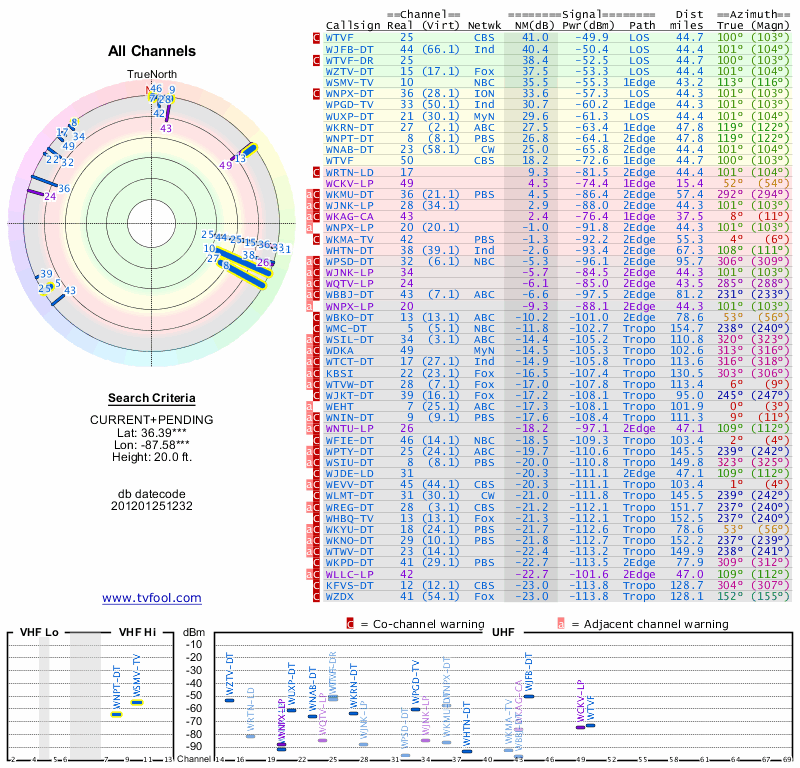 Here are the results for your location. The transmitter database was last updated on June 7, 2013. For more information about these plots and how to interpret them, please check out the Signal Analysis FAQ.