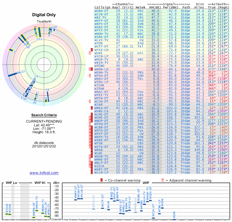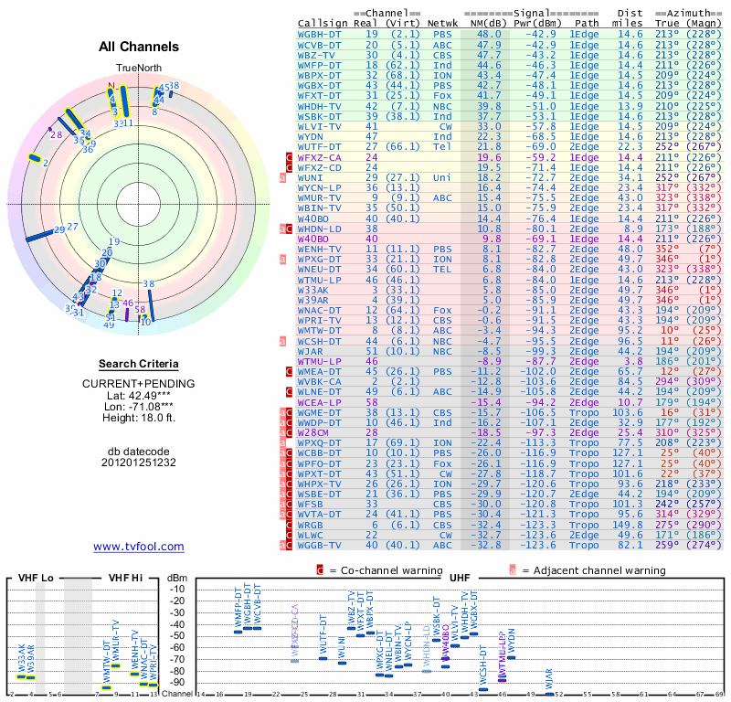 Here are the results for your location. The transmitter database was last updated on June 7, 2013. For more information about these plots and how to interpret them, please check out the Signal Analysis FAQ.