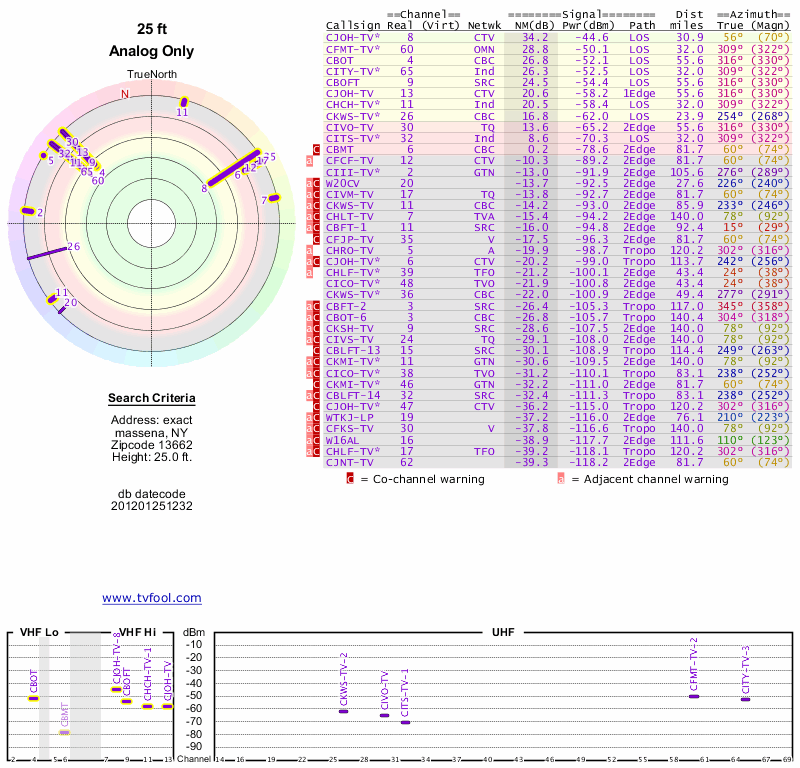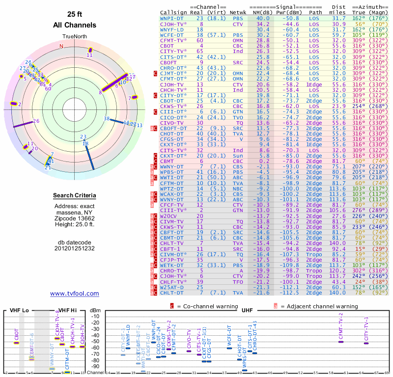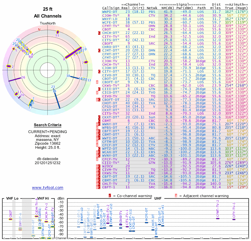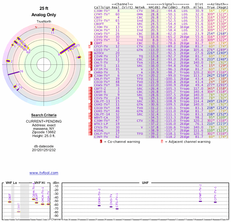Here are the results for your location. The transmitter database was last updated on June 7, 2013. For more information about these plots and how to interpret them, please check out the Signal Analysis FAQ.
