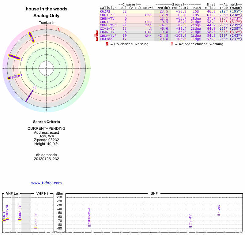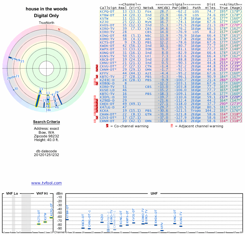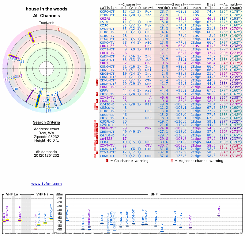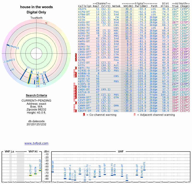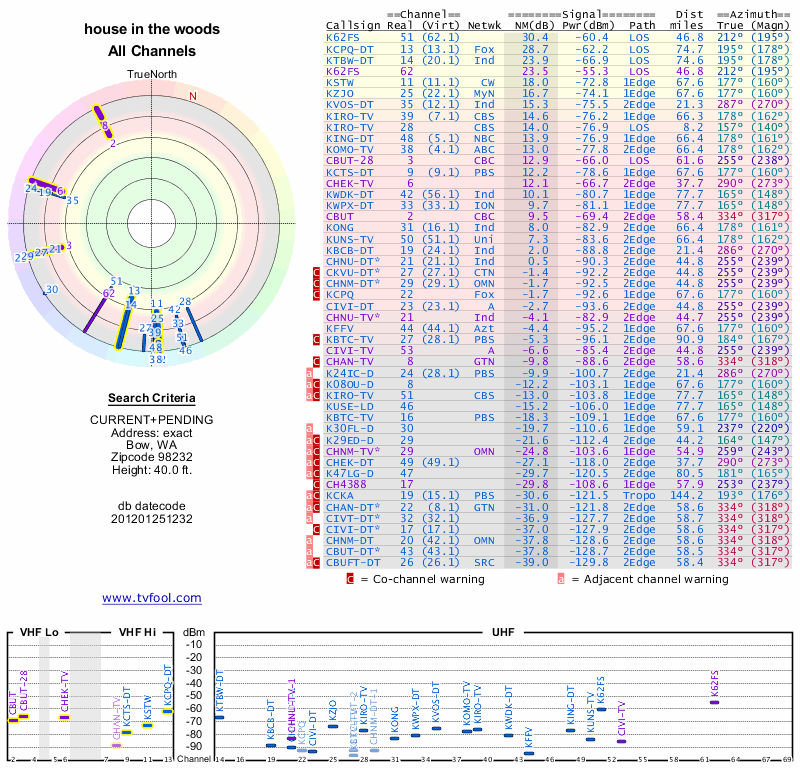 Here are the results for your location. The transmitter database was last updated on June 7, 2013. For more information about these plots and how to interpret them, please check out the Signal Analysis FAQ.