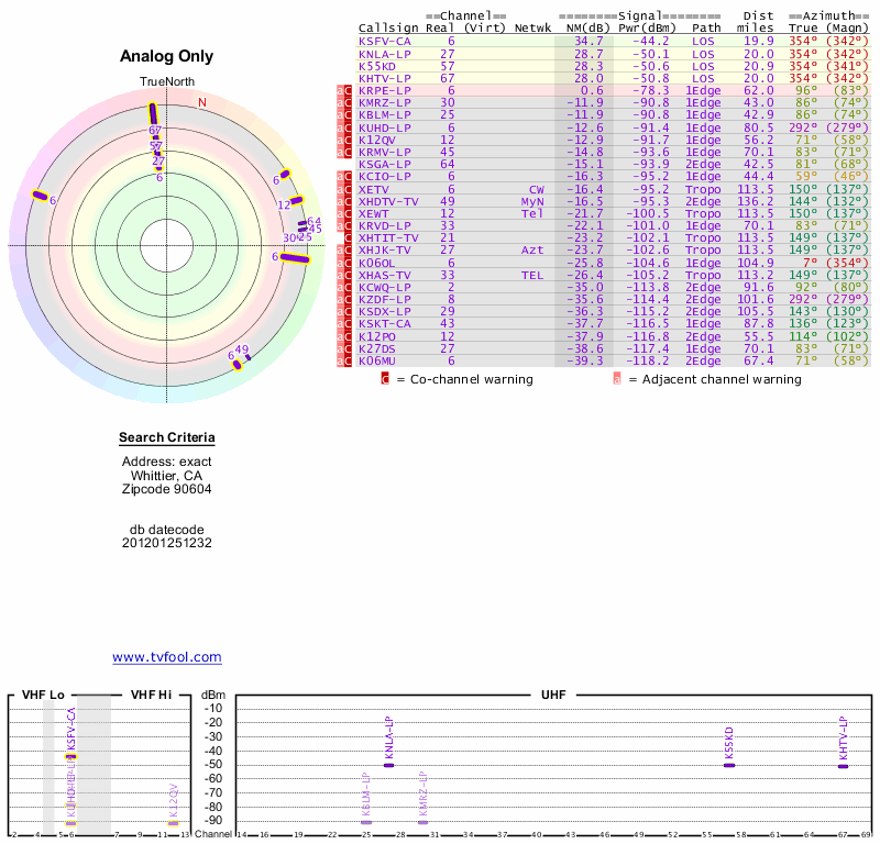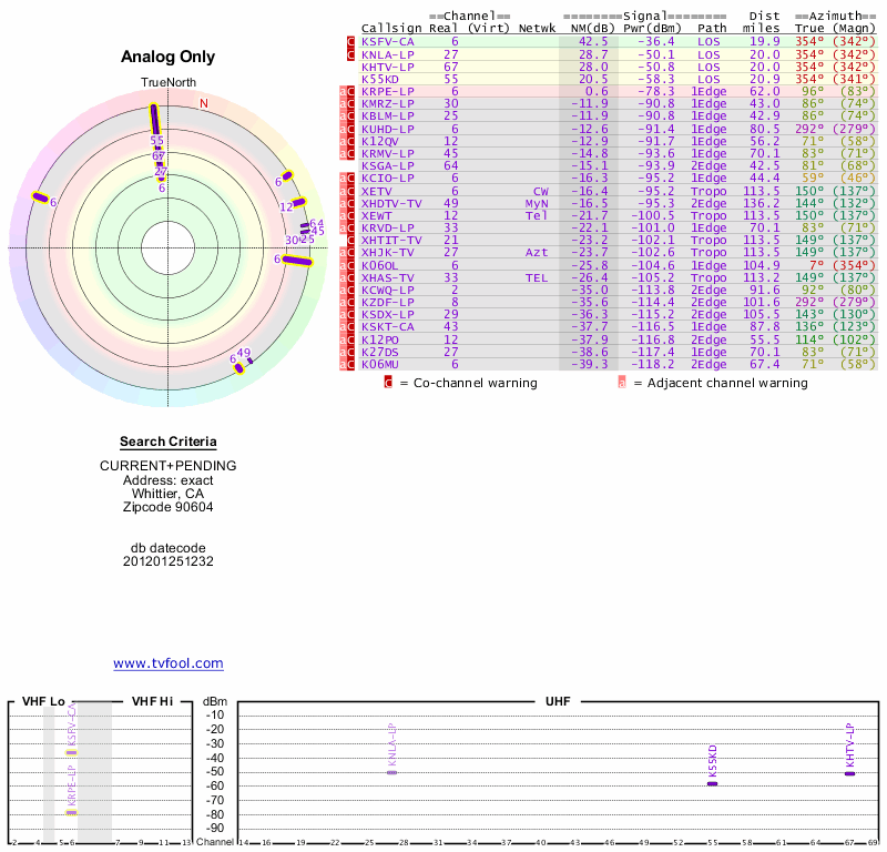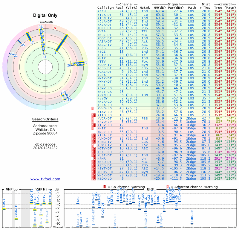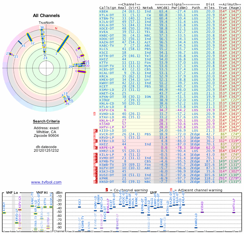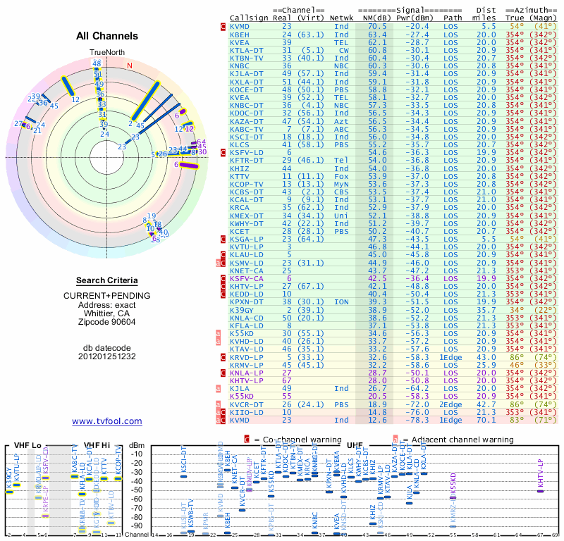Here are the results for your location. The transmitter database was last updated on June 7, 2013. For more information about these plots and how to interpret them, please check out the Signal Analysis FAQ.