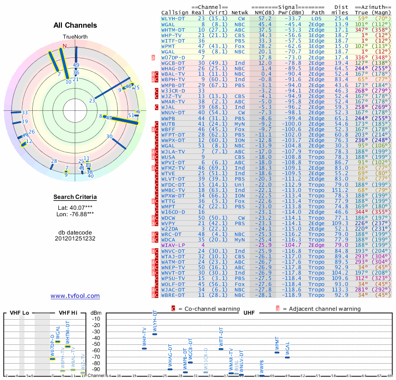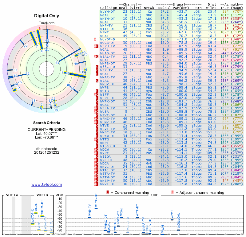 Here are the results for your location. The transmitter database was last updated on June 7, 2013. For more information about these plots and how to interpret them, please check out the Signal Analysis FAQ.
