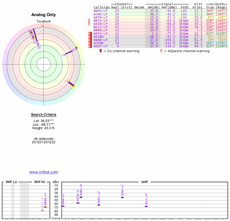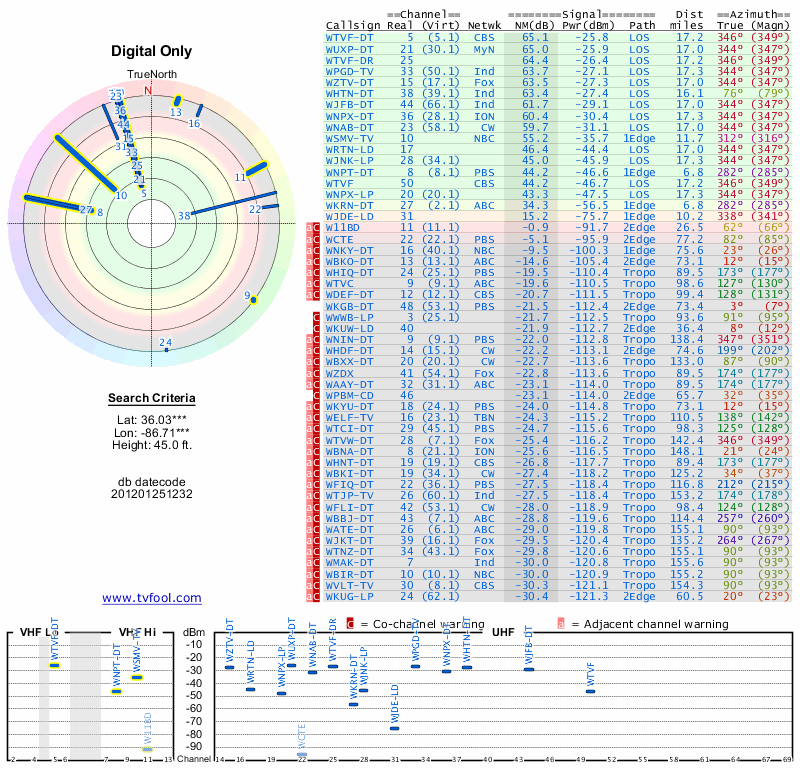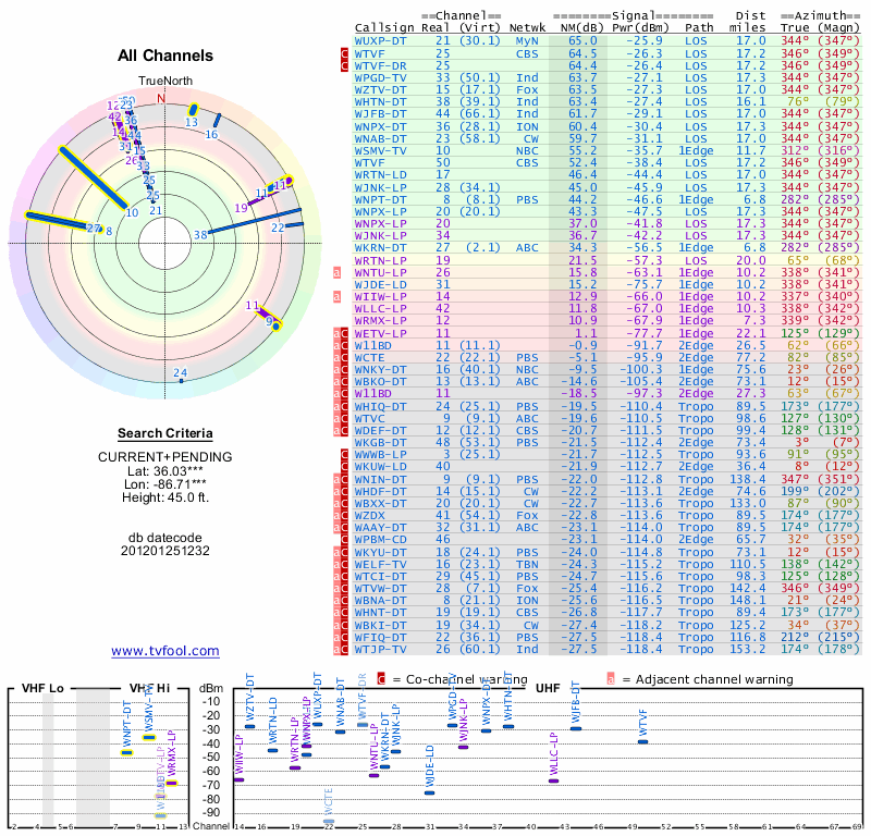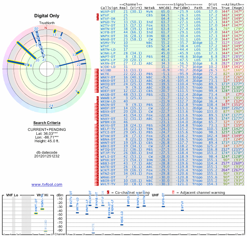 Here are the results for your location. The transmitter database was last updated on June 7, 2013. For more information about these plots and how to interpret them, please check out the Signal Analysis FAQ.