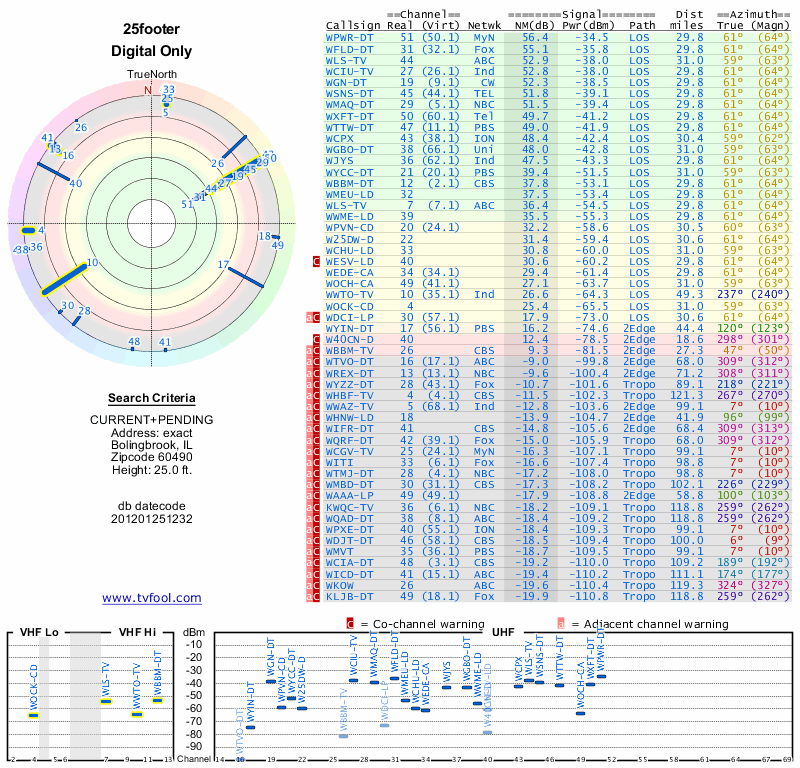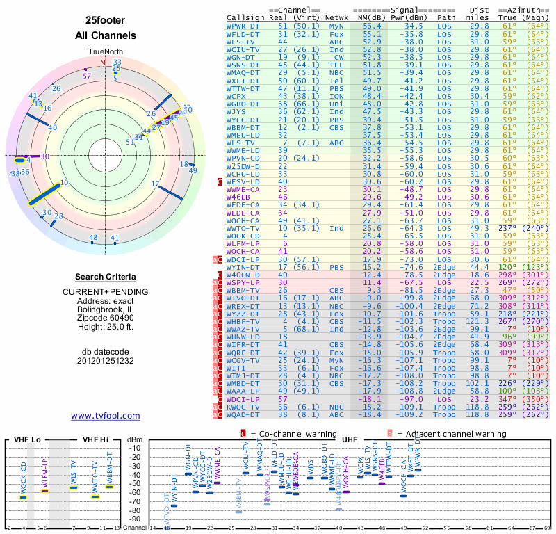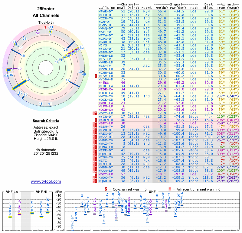 Here are the results for your location. The transmitter database was last updated on June 7, 2013. For more information about these plots and how to interpret them, please check out the Signal Analysis FAQ.