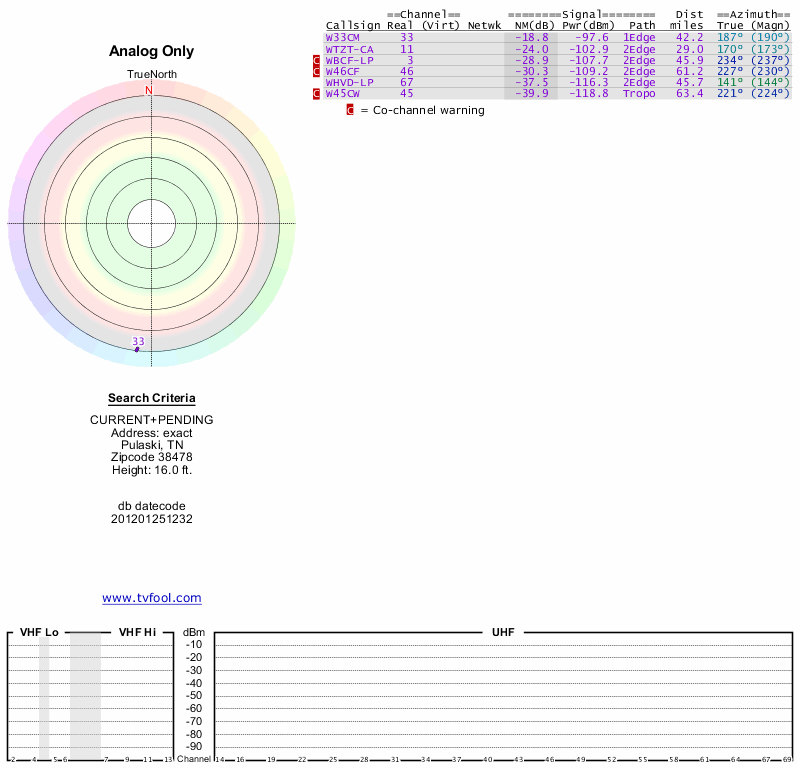Here are the results for your location. The transmitter database was last updated on June 7, 2013. For more information about these plots and how to interpret them, please check out the Signal Analysis FAQ.