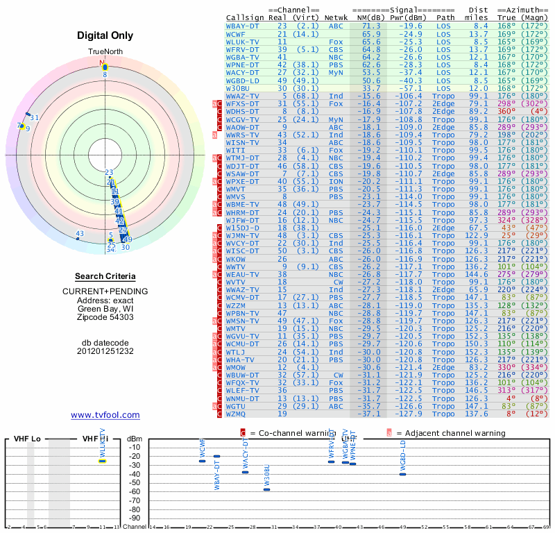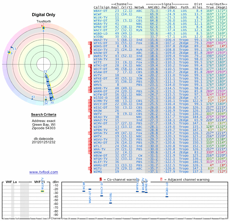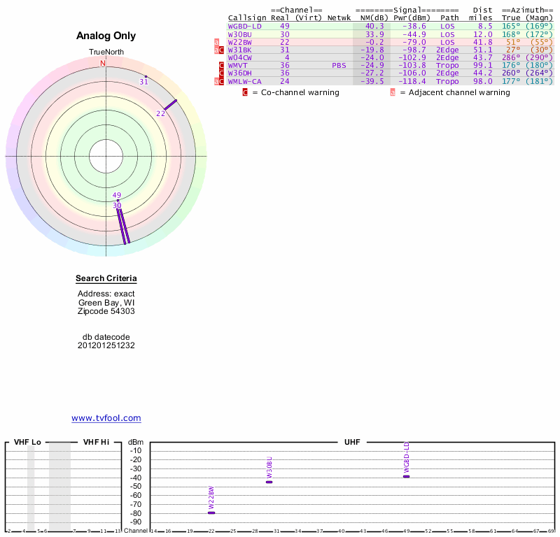 Here are the results for your location. The transmitter database was last updated on June 7, 2013. For more information about these plots and how to interpret them, please check out the Signal Analysis FAQ.