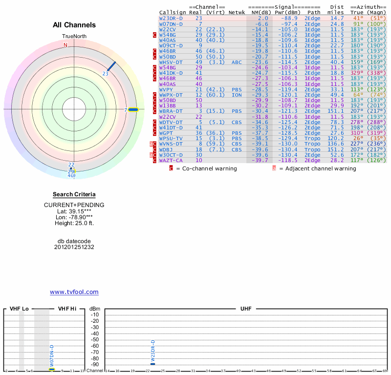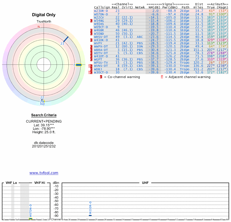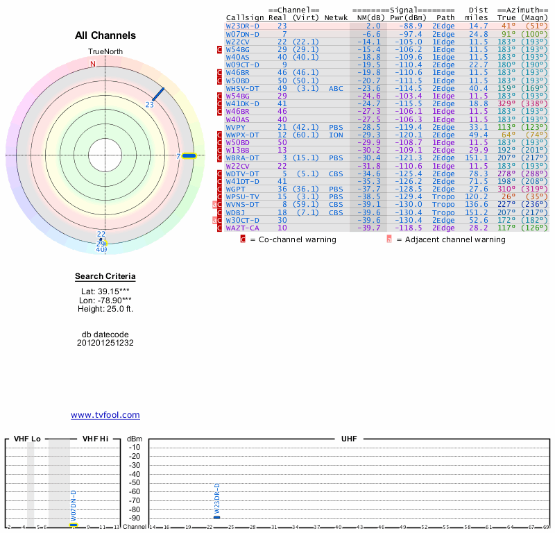 Here are the results for your location. The transmitter database was last updated on June 7, 2013. For more information about these plots and how to interpret them, please check out the Signal Analysis FAQ.