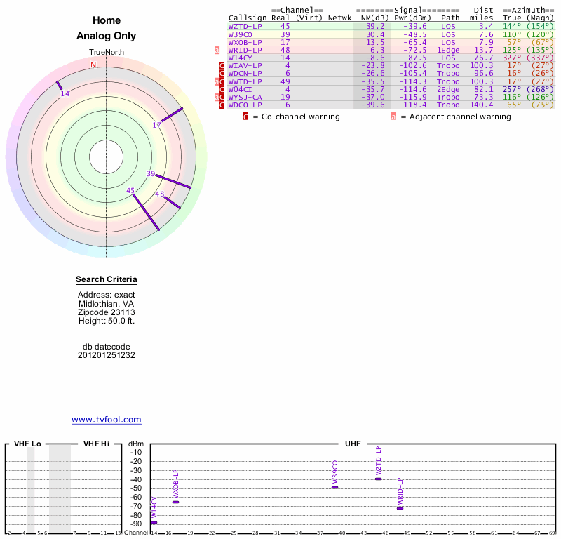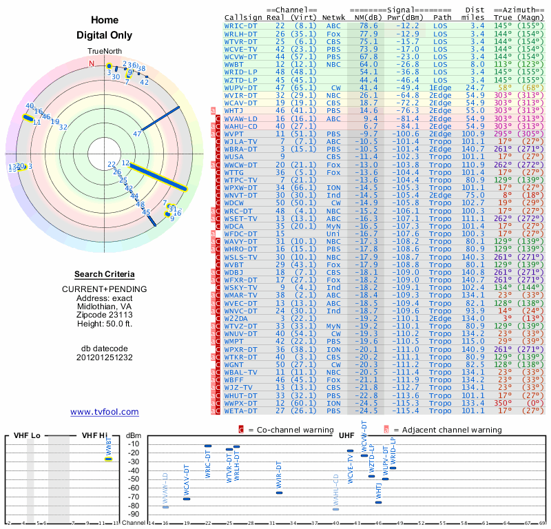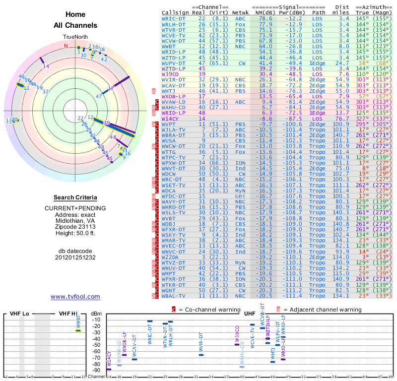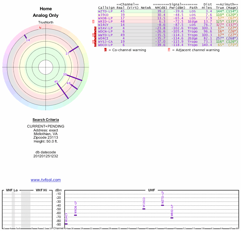 Here are the results for your location. The transmitter database was last updated on June 7, 2013. For more information about these plots and how to interpret them, please check out the Signal Analysis FAQ.