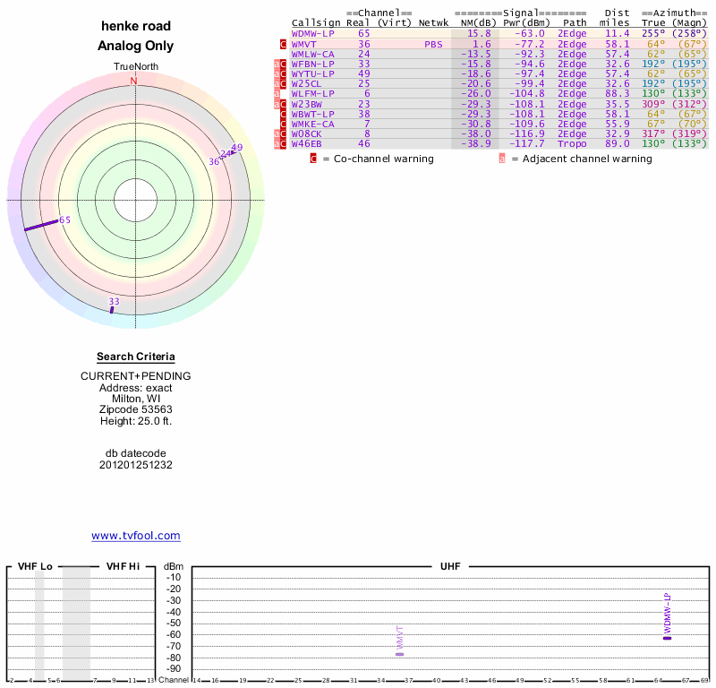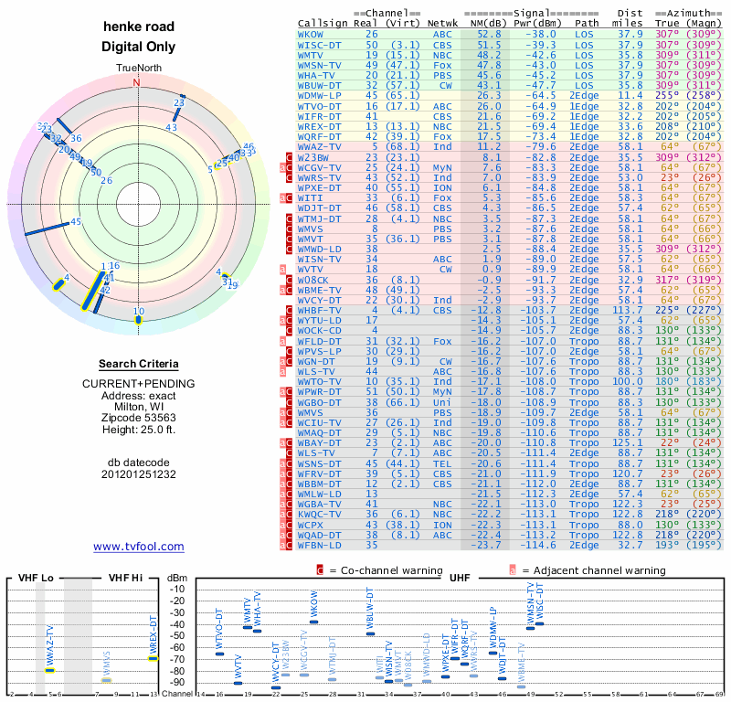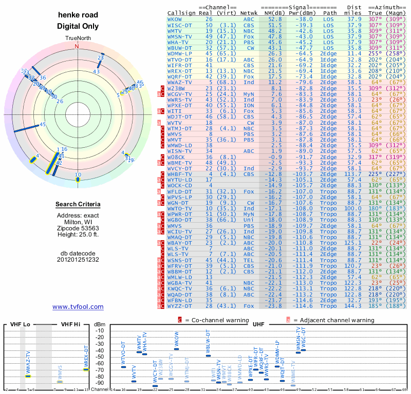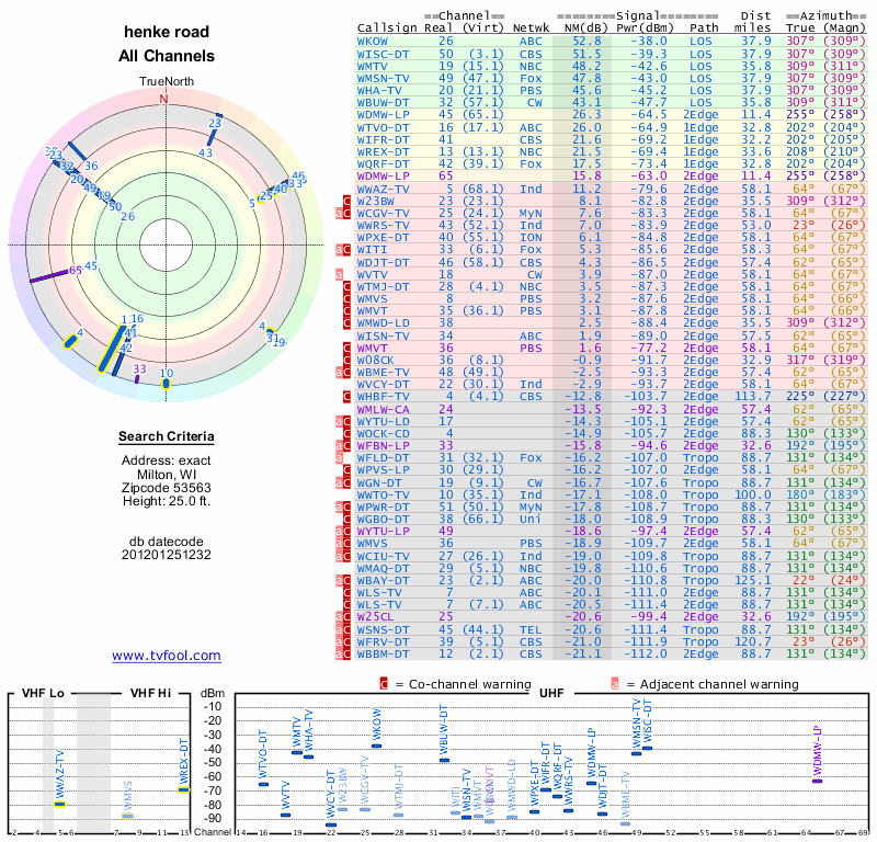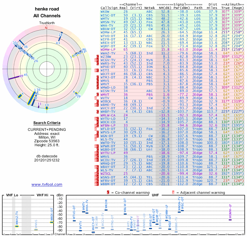 Here are the results for your location. The transmitter database was last updated on June 7, 2013. For more information about these plots and how to interpret them, please check out the Signal Analysis FAQ.