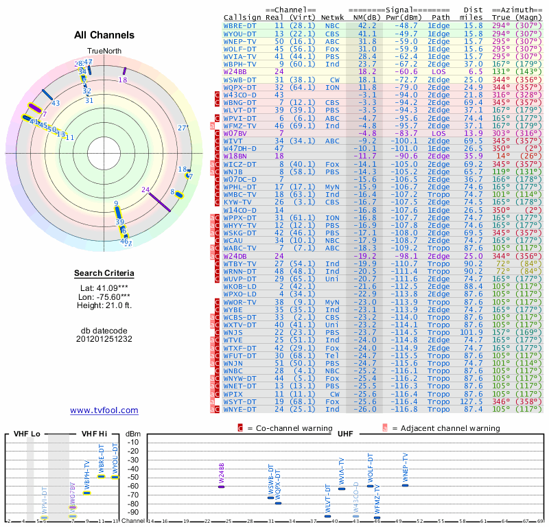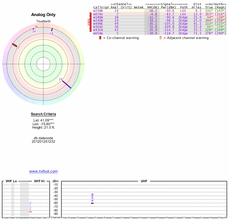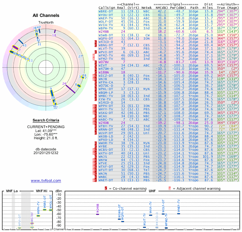 Here are the results for your location. The transmitter database was last updated on June 7, 2013. For more information about these plots and how to interpret them, please check out the Signal Analysis FAQ.