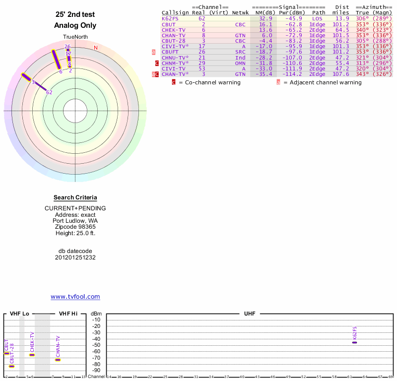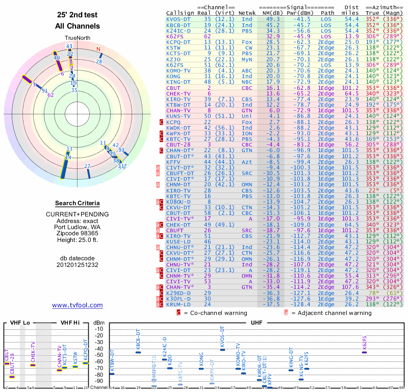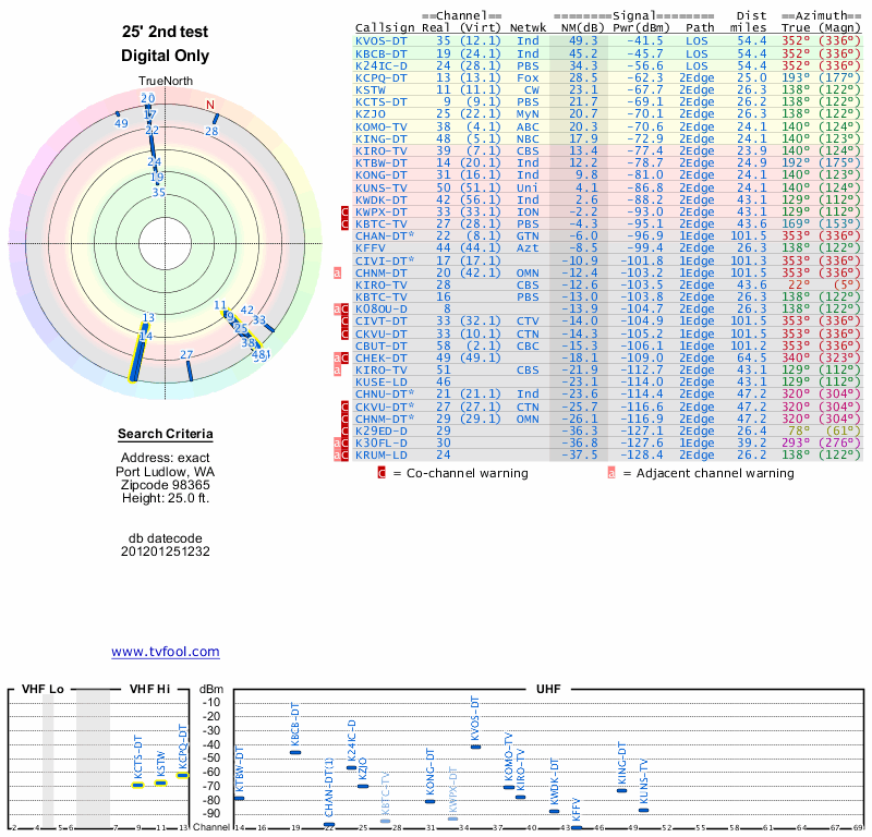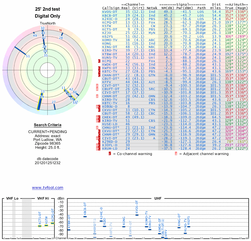 Here are the results for your location. The transmitter database was last updated on June 7, 2013. For more information about these plots and how to interpret them, please check out the Signal Analysis FAQ.