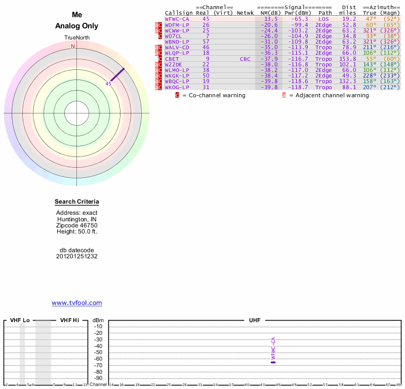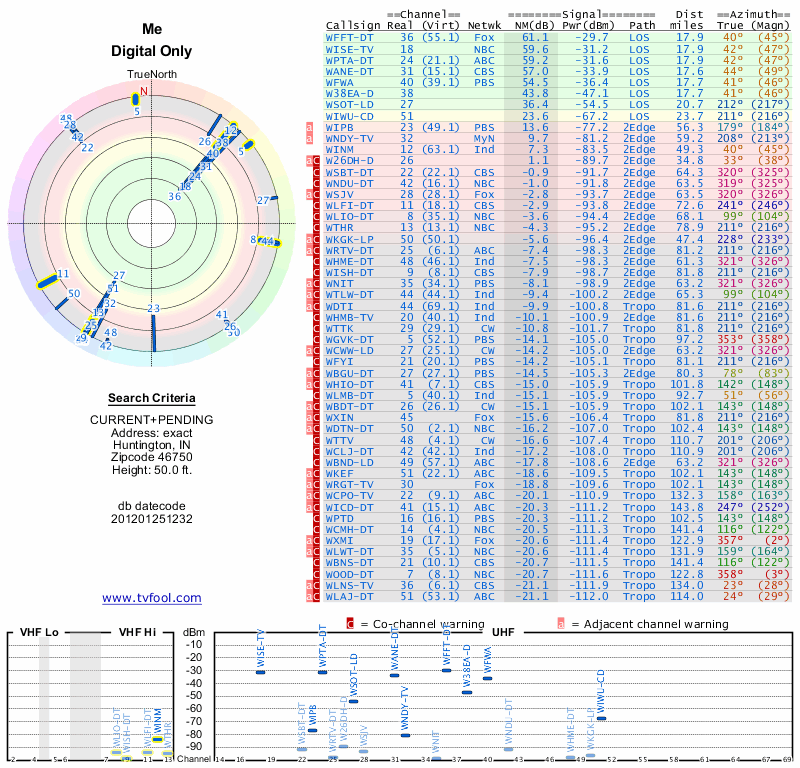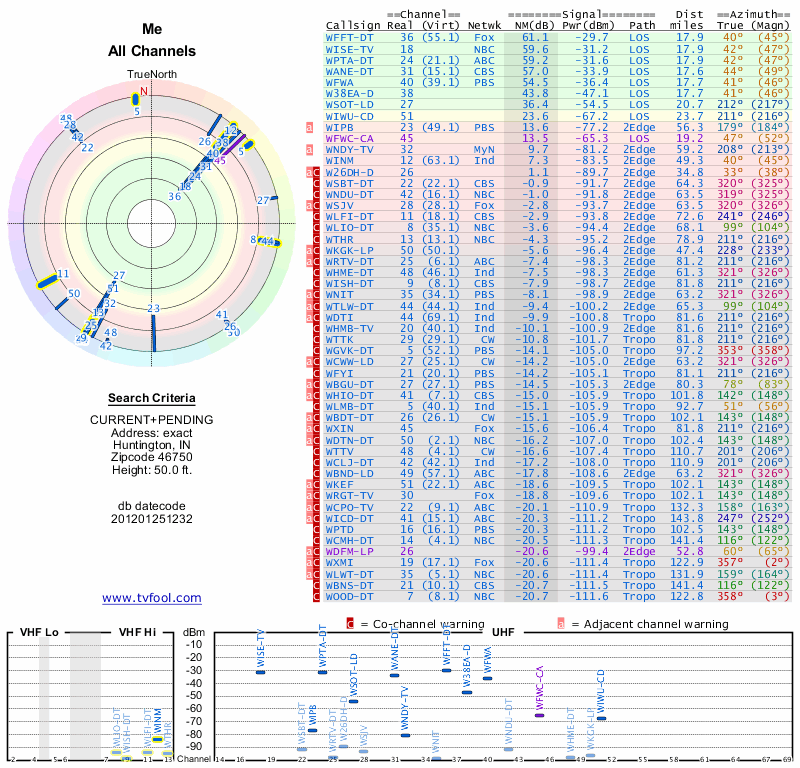 Here are the results for your location. The transmitter database was last updated on June 7, 2013. For more information about these plots and how to interpret them, please check out the Signal Analysis FAQ.