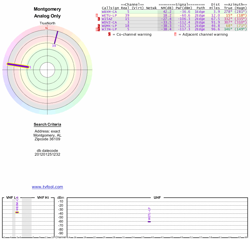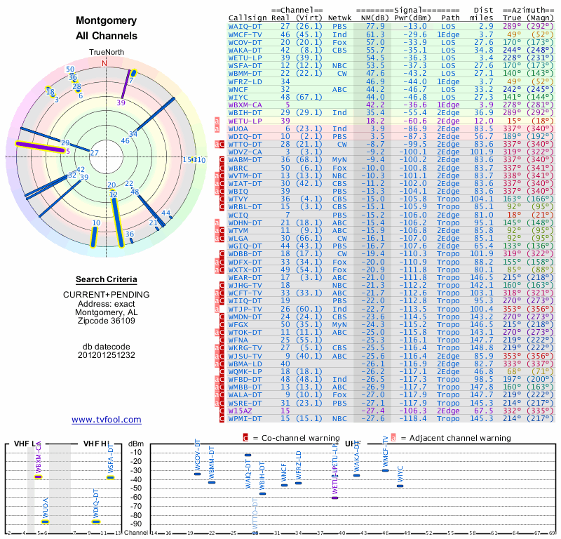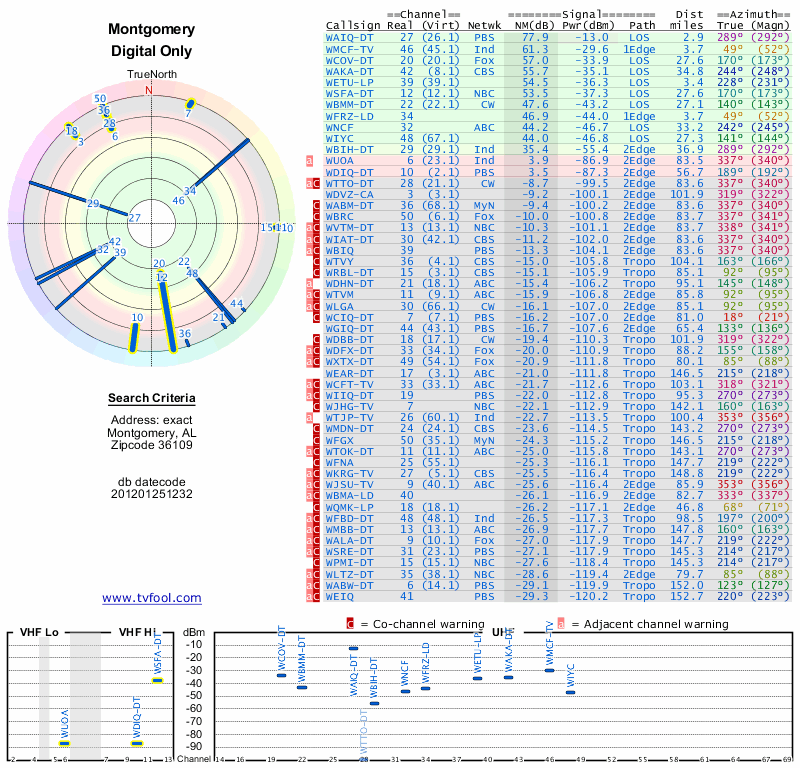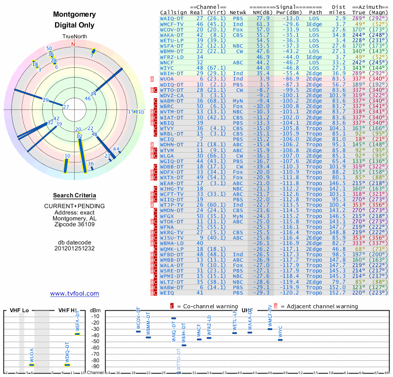 Here are the results for your location. The transmitter database was last updated on June 7, 2013. For more information about these plots and how to interpret them, please check out the Signal Analysis FAQ.