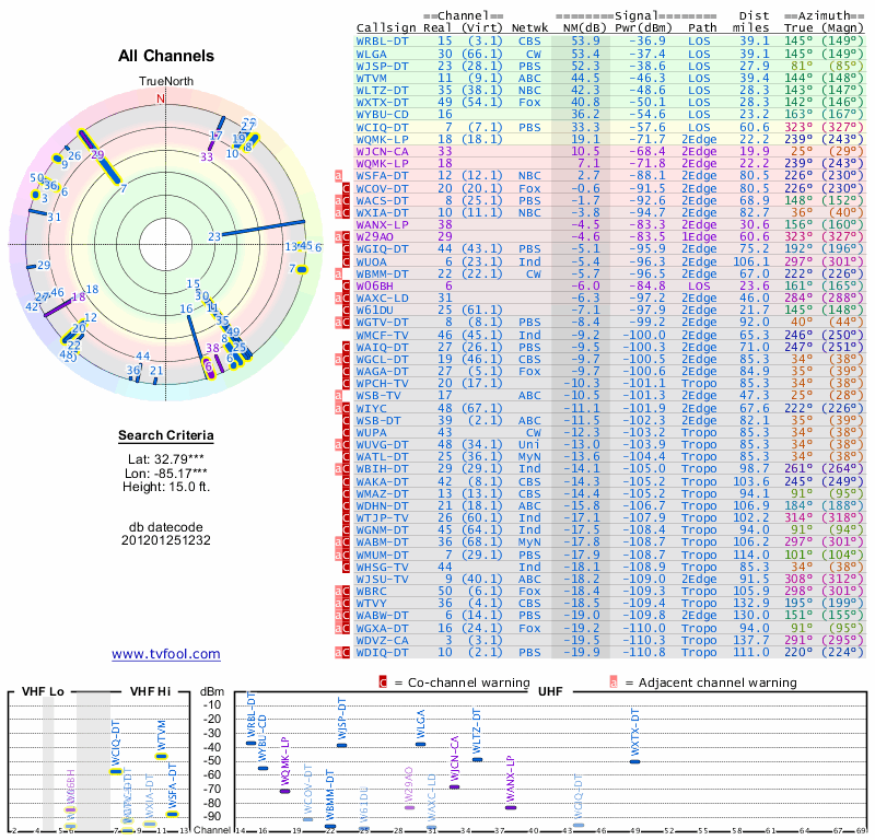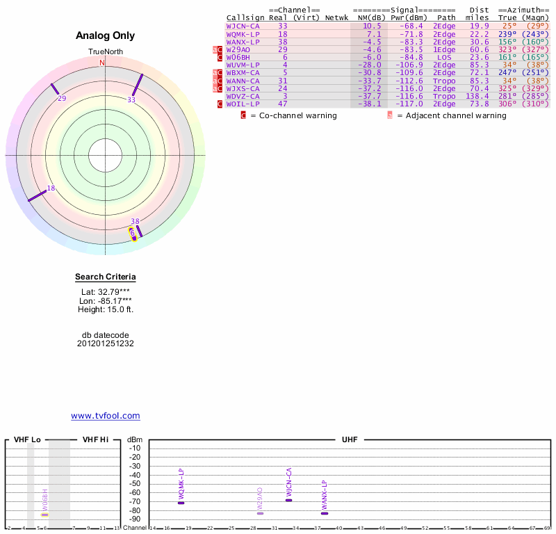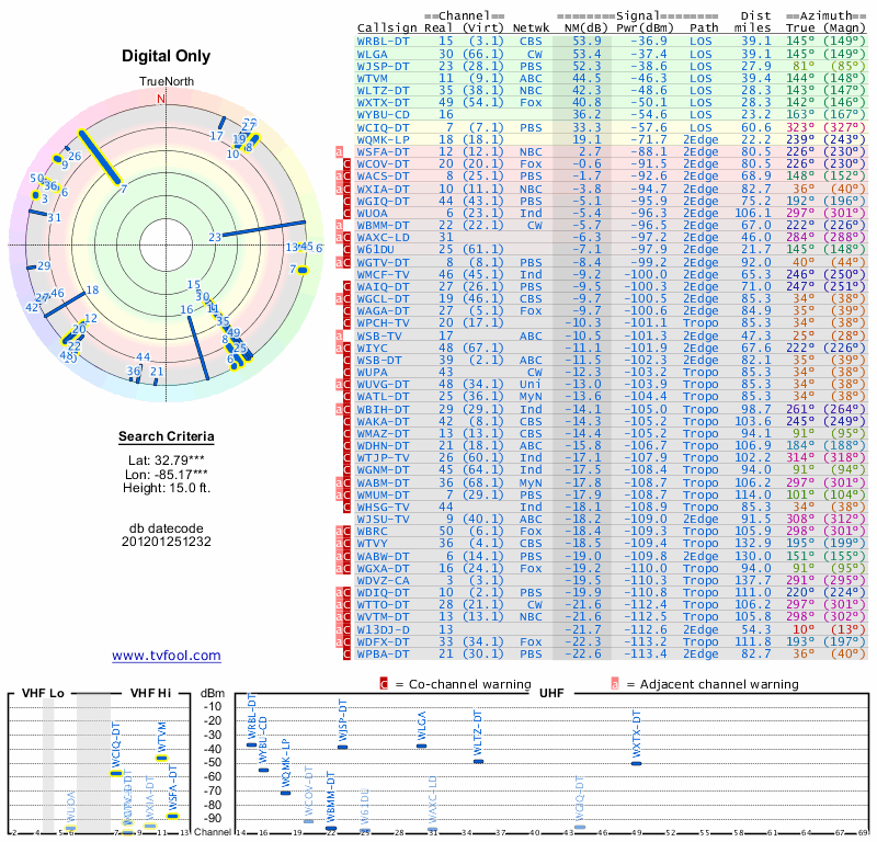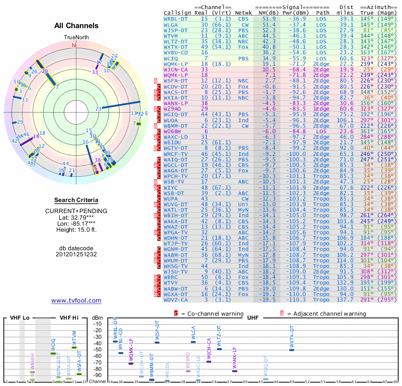 Here are the results for your location. The transmitter database was last updated on June 7, 2013. For more information about these plots and how to interpret them, please check out the Signal Analysis FAQ.